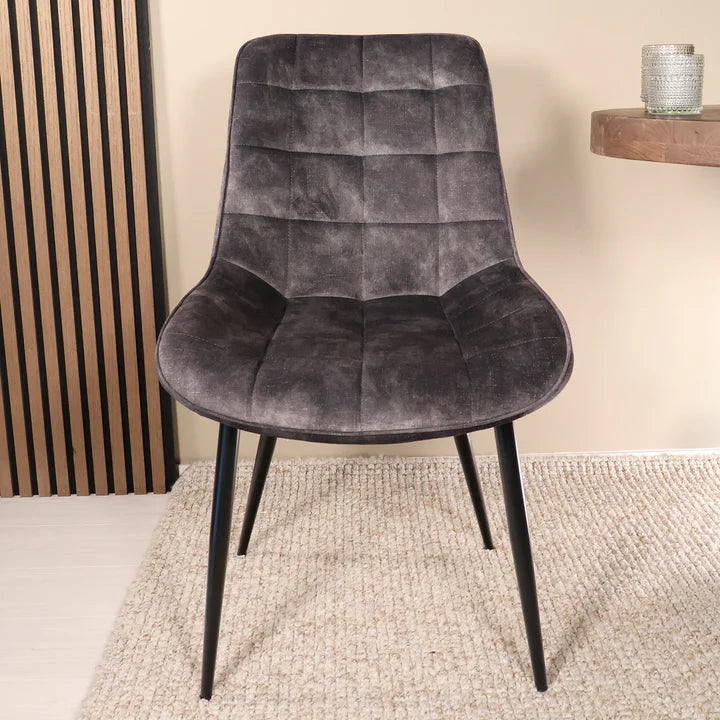 Creëer een luxueuze sfeer aan tafel met deze elegante velvet eetkamerstoel. De zachte fluweelachtige stof voelt heerlijk comfortabel aan en geeft de stoel een verfijnde uitstraling, terwijl het metalen onderstel zorgt voor een modern contrast. Het subtiele ruitpatroon op de rugleuning maakt deze stoel tot een stijlvolle blikvanger in iedere eetkamer of woonkamer.