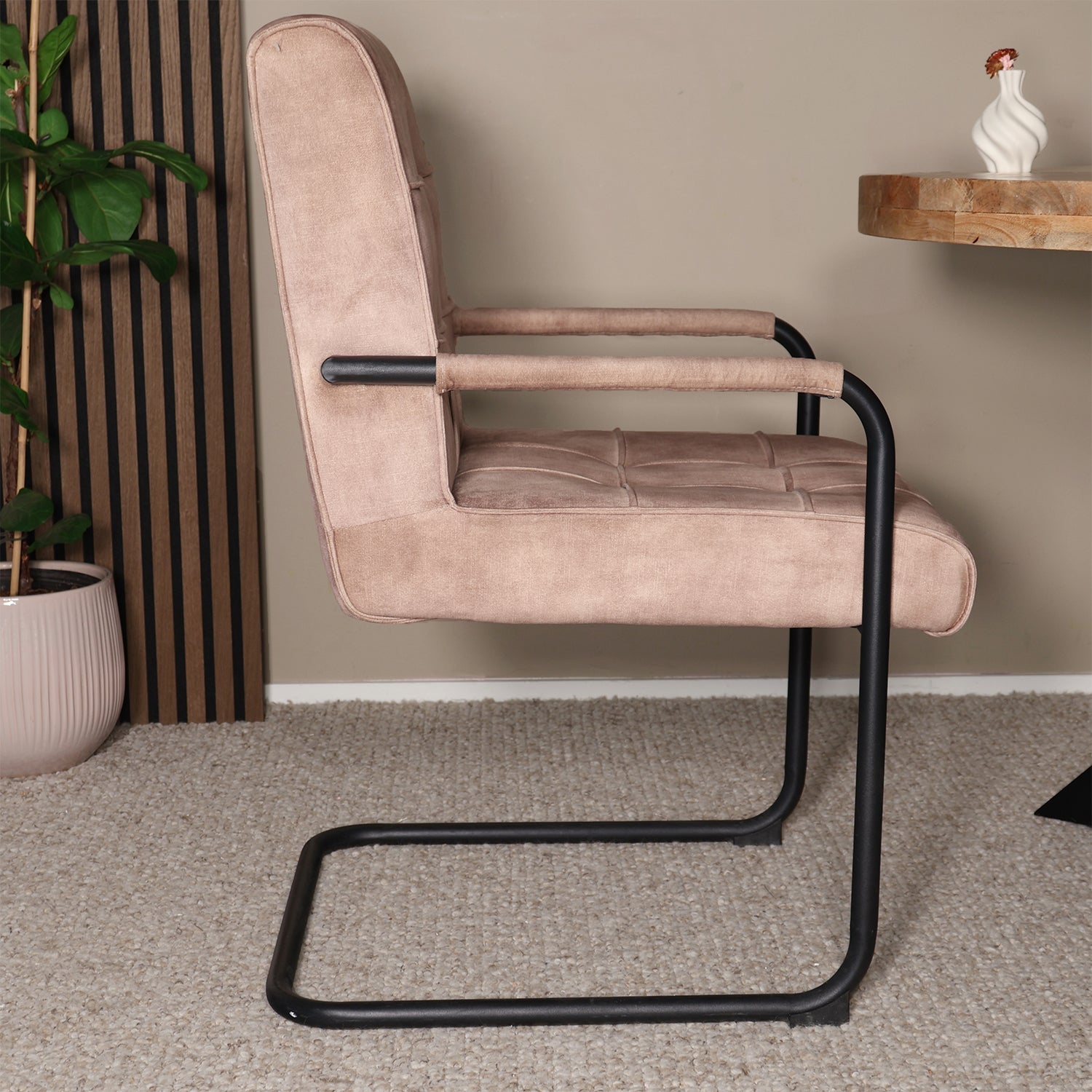 Stoer, comfortabel en stijlvol – deze eetkamerstoel met armleuningen brengt karakter aan iedere eethoek. De velvet bekleding voelt zacht aan en heeft een subtiel geblokt patroon, terwijl het zwarte metalen frame zorgt voor een robuuste industriële touch. Ideaal voor lange diners, gezellige avonden en sfeervolle momenten aan tafel.
