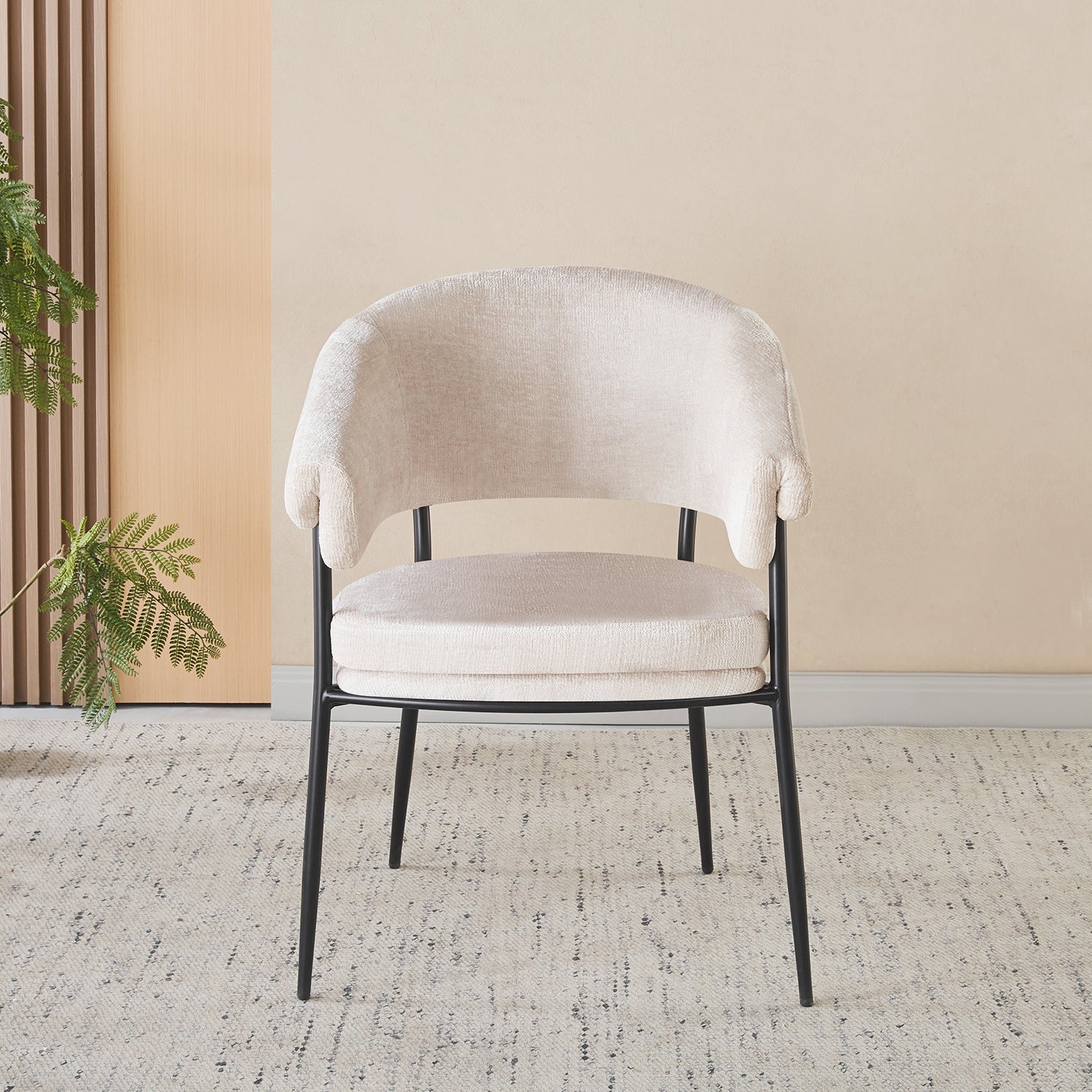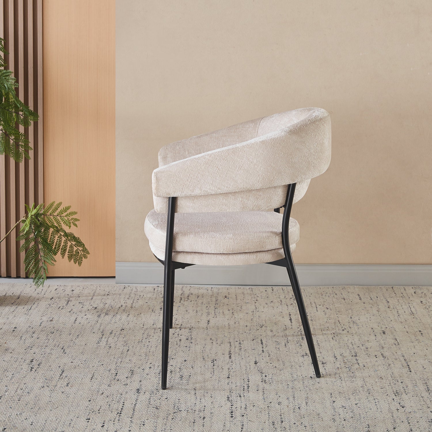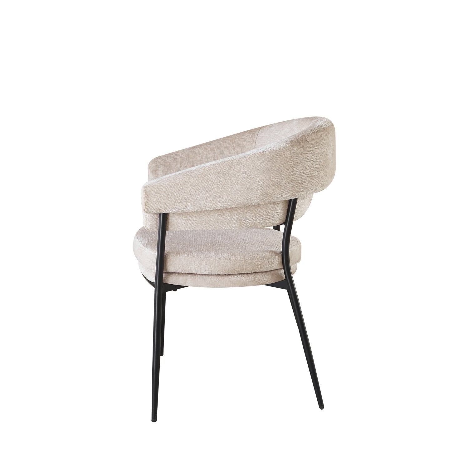 Laat stijl en comfort samenkomen met deze rustgevende eetkamerstoel in minimalistische Japandi-stijl. De combinatie van uitnodigende stof en een strak metalen onderstel creëert een kalme, stijlvolle uitstraling die past in ieder interieur. Dankzij de geboden rugleuning geniet je van maximale ondersteuning tijdens lange diners of gezellige momenten aan tafel.