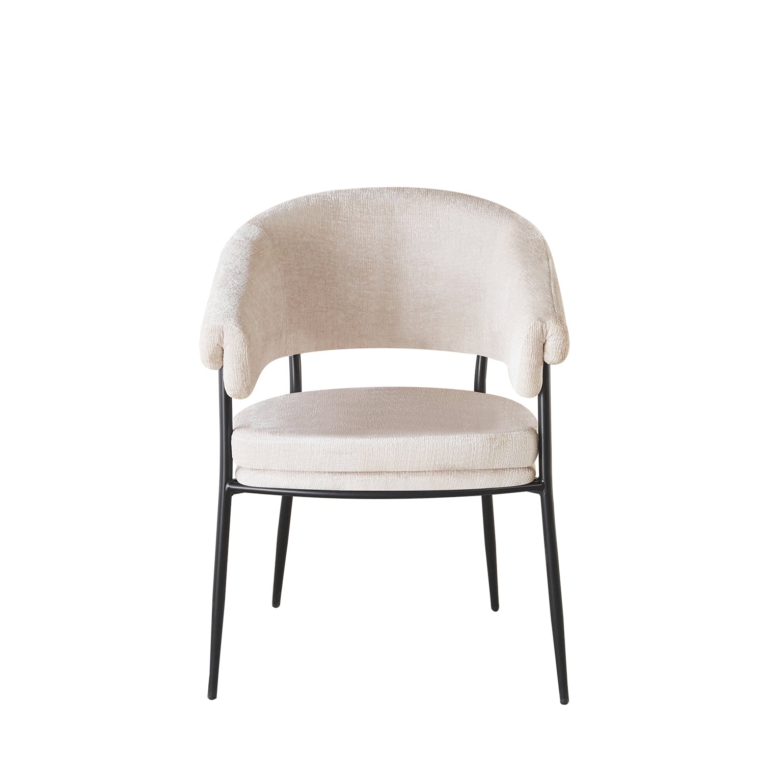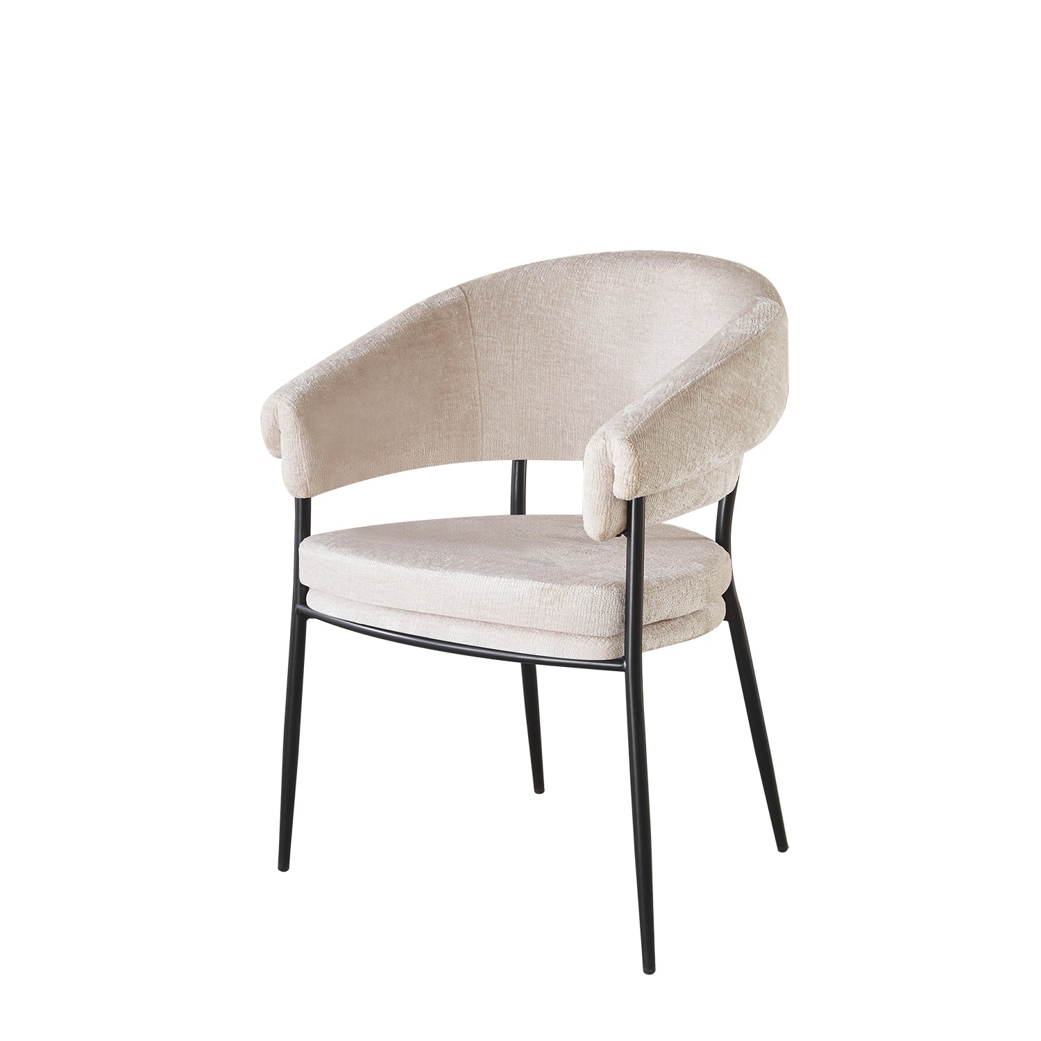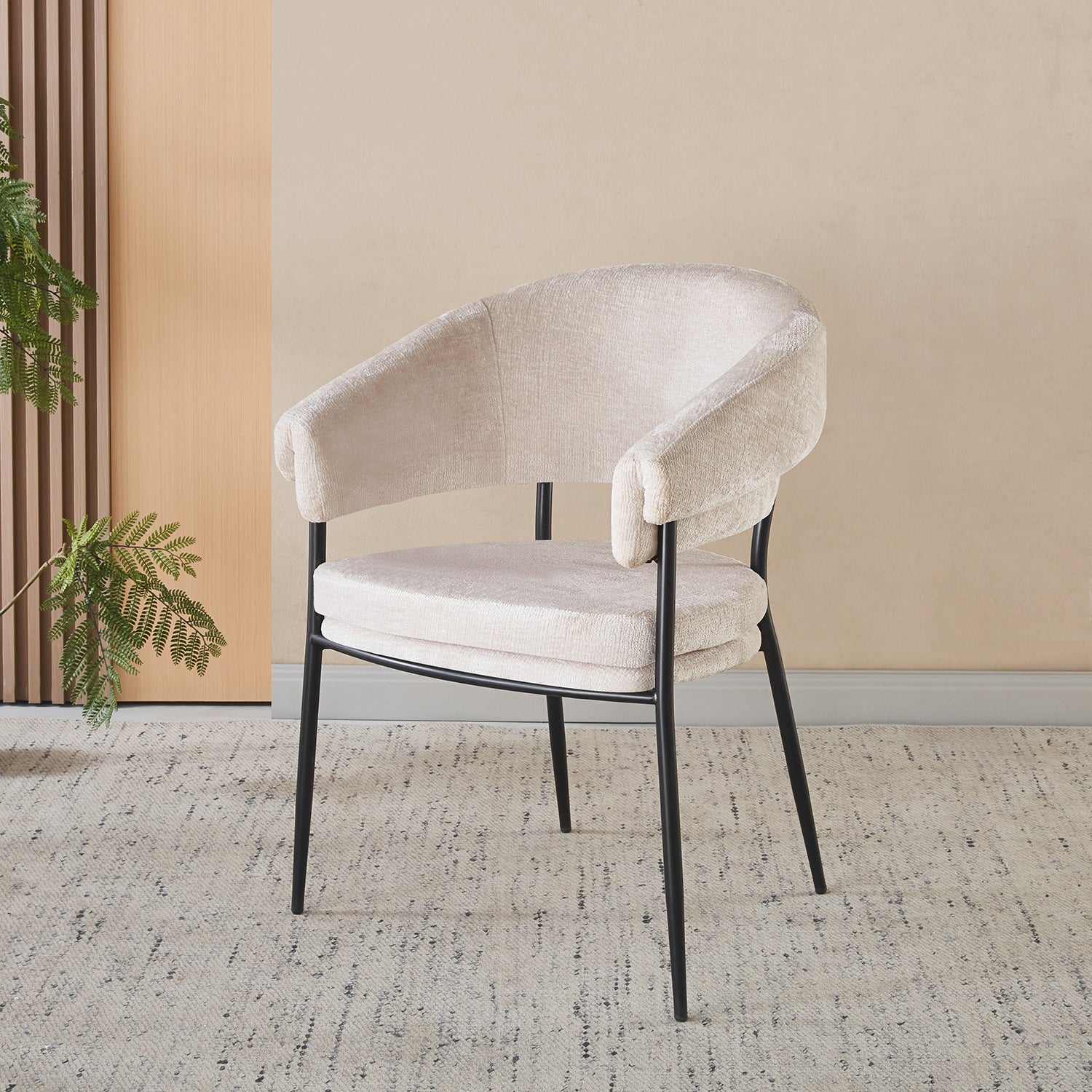 Laat stijl en comfort samenkomen met deze rustgevende eetkamerstoel in minimalistische Japandi-stijl. De combinatie van uitnodigende stof en een strak metalen onderstel creëert een kalme, stijlvolle uitstraling die past in ieder interieur. Dankzij de geboden rugleuning geniet je van maximale ondersteuning tijdens lange diners of gezellige momenten aan tafel.