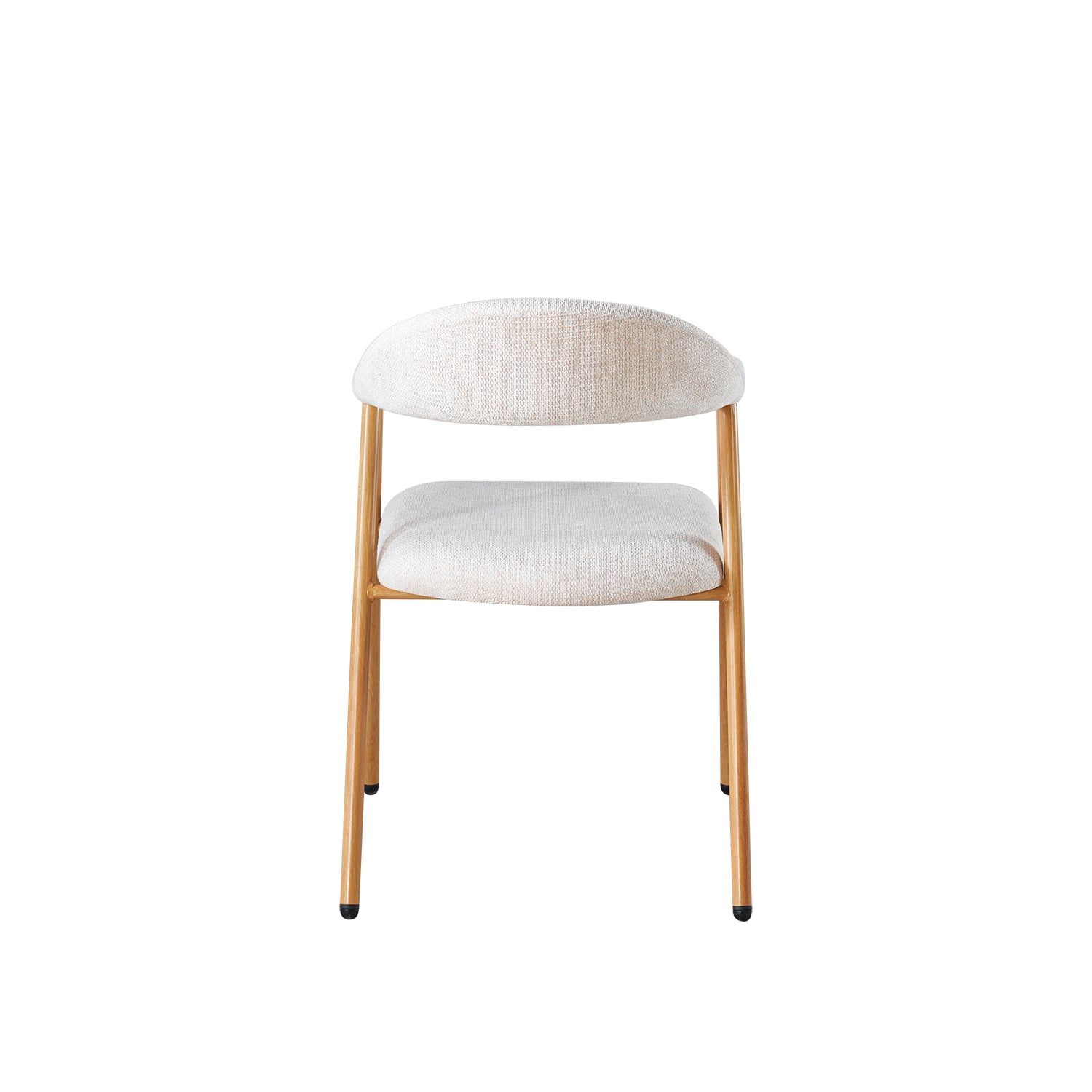 Laat stijl en comfort samenkomen met deze minimalistische eetkamerstoel in Japandi-stijl. De combinatie van geweven stof en een houtlook onderstel creëert een strakke, karakteristieke uitstraling die past in ieder interieur. Dankzij de rondlopende rugleuning geniet je van optimale ondersteuning tijdens gezellige diners of knusse momenten aan tafel.