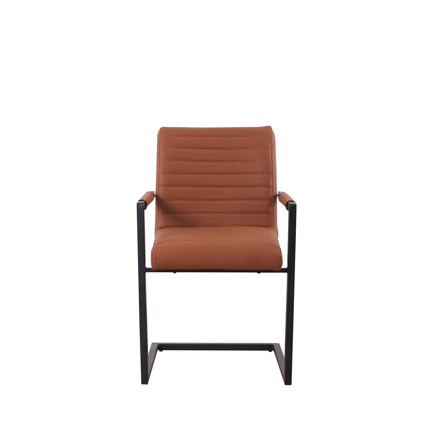 Deze stoere eetkamerstoel met armleuningen combineert robuuste looks met praktisch comfort. De zachte eco-lederen zitting en het matzwarte metalen frame geven de stoel een moderne, industriële uitstraling die moeiteloos aansluit bij diverse interieurstijlen. Perfect om lange avonden aan tafel te zitten - van diner tot borrelmoment.
