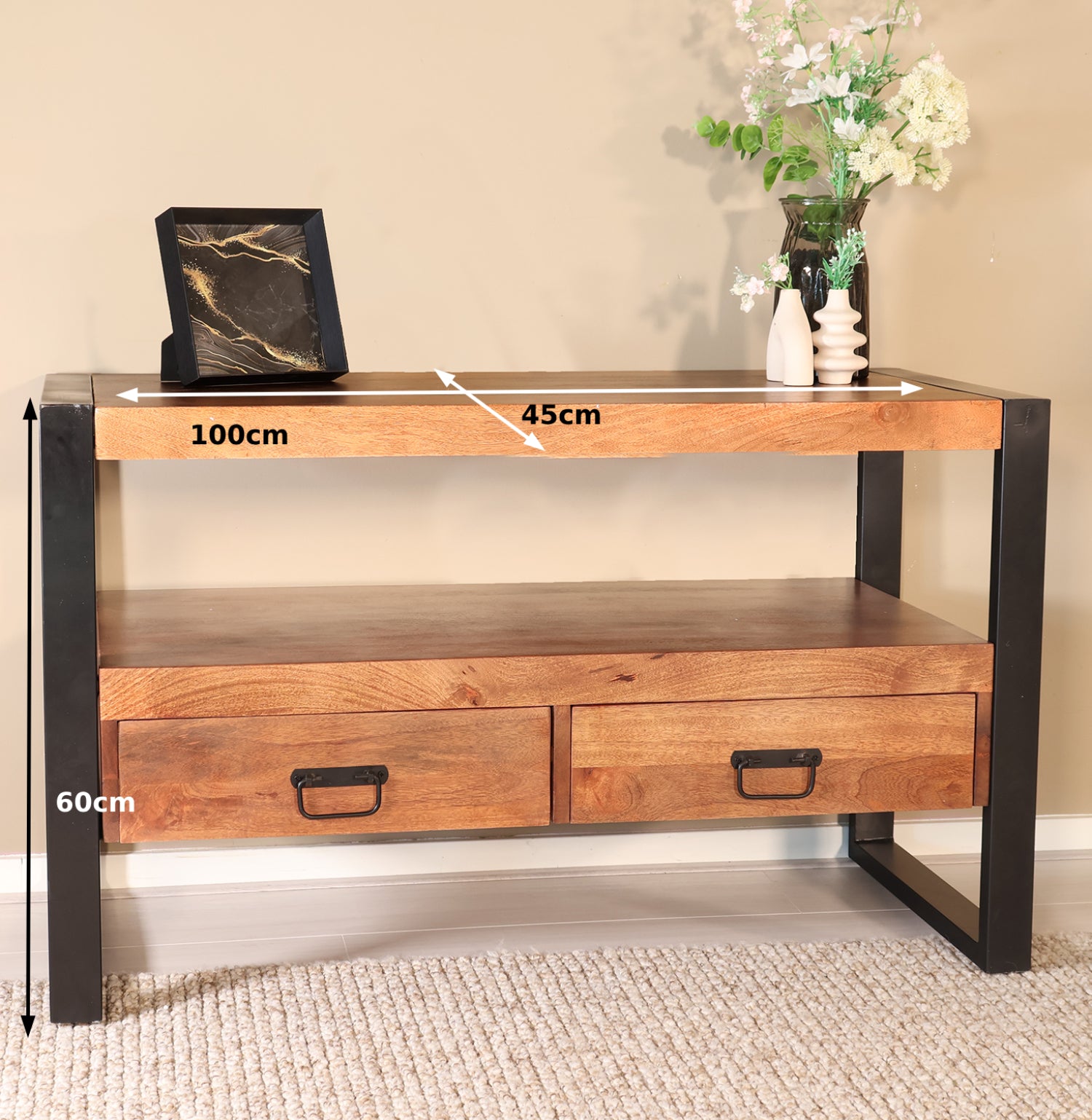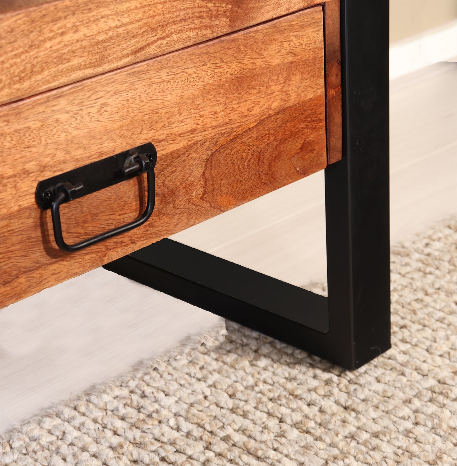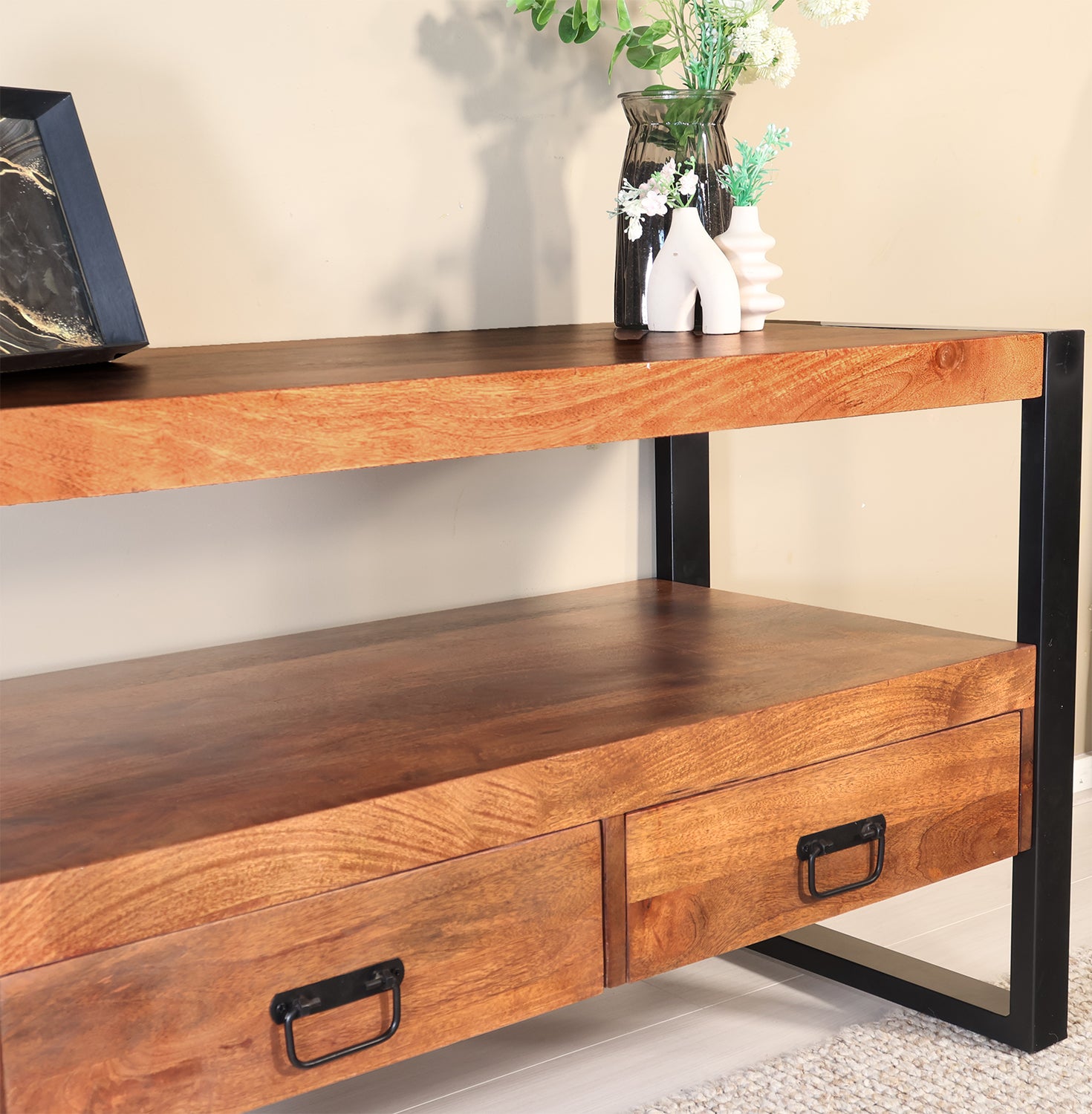Dit wandmeubel heeft een mangohouten kast en plank, met een zwart metalen onderstel. Door de strakke uitstraling en het compacte formaat kun je het tv meubel op veel plaatsen kwijt, niet alleen als TV meubel maar ook als stoer en industrieel wandmeubel! Dit meubel is slijtvast en geeft jarenlang plezier!
