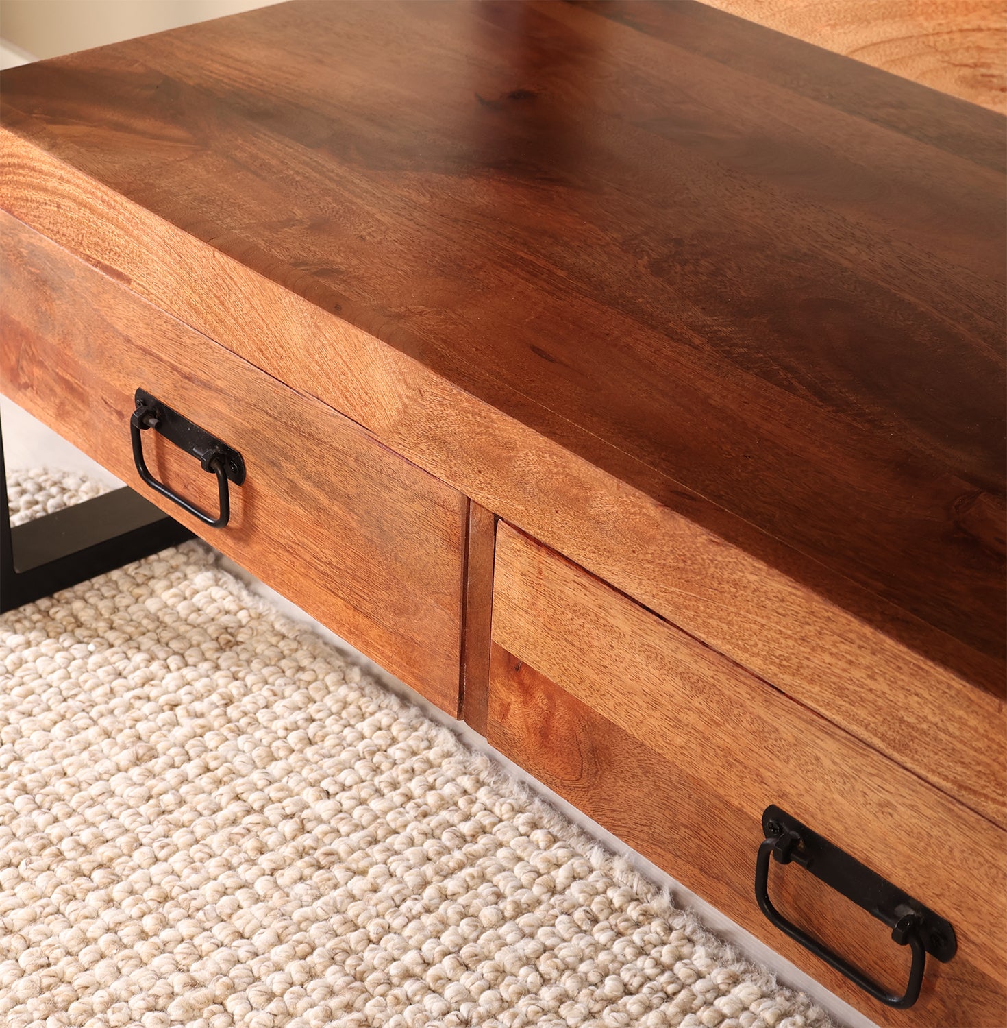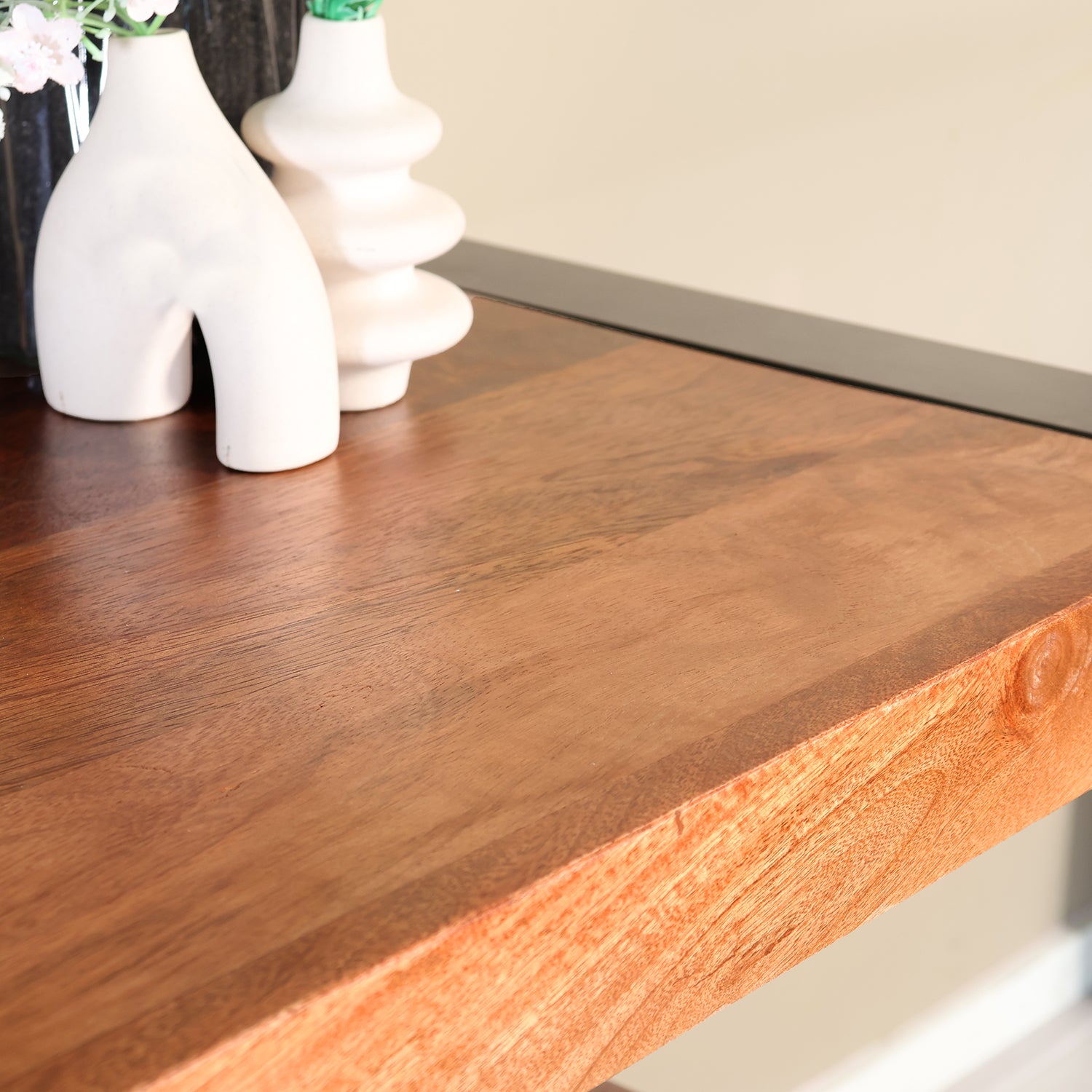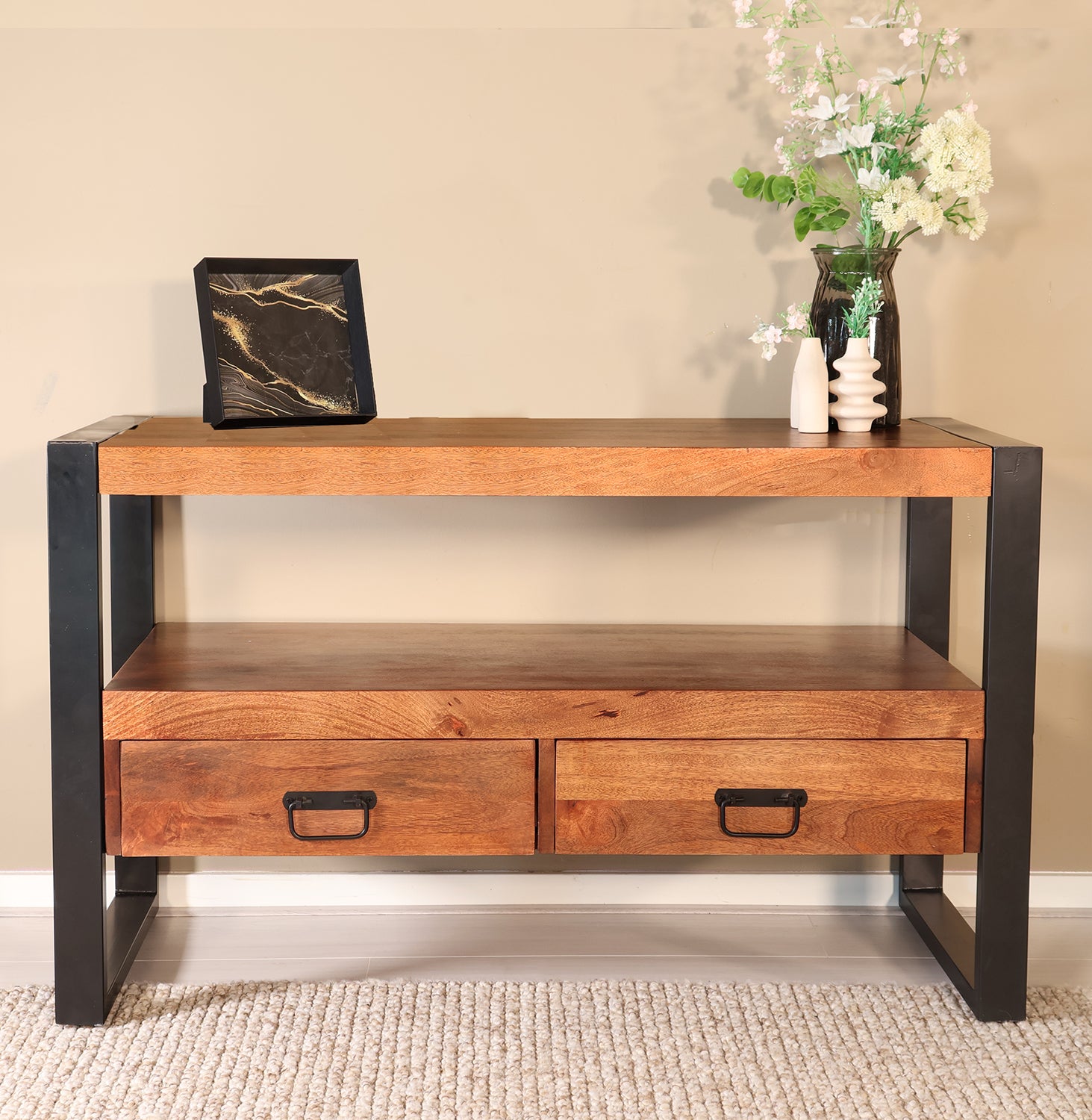 Dit wandmeubel heeft een mangohouten kast en plank, met een zwart metalen onderstel. Door de strakke uitstraling en het compacte formaat kun je het tv meubel op veel plaatsen kwijt, niet alleen als TV meubel maar ook als stoer en industrieel wandmeubel! Dit meubel is slijtvast en geeft jarenlang plezier!