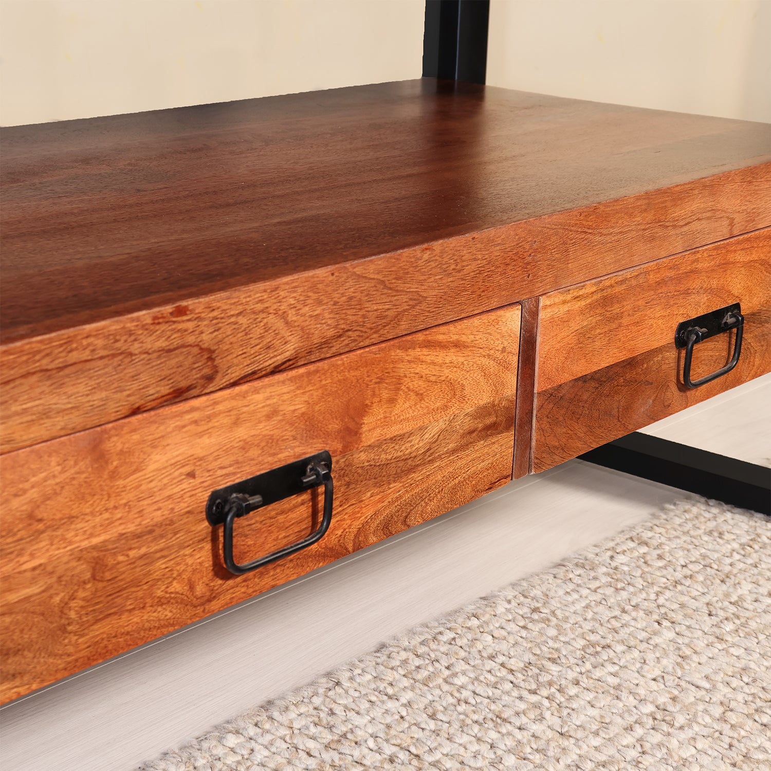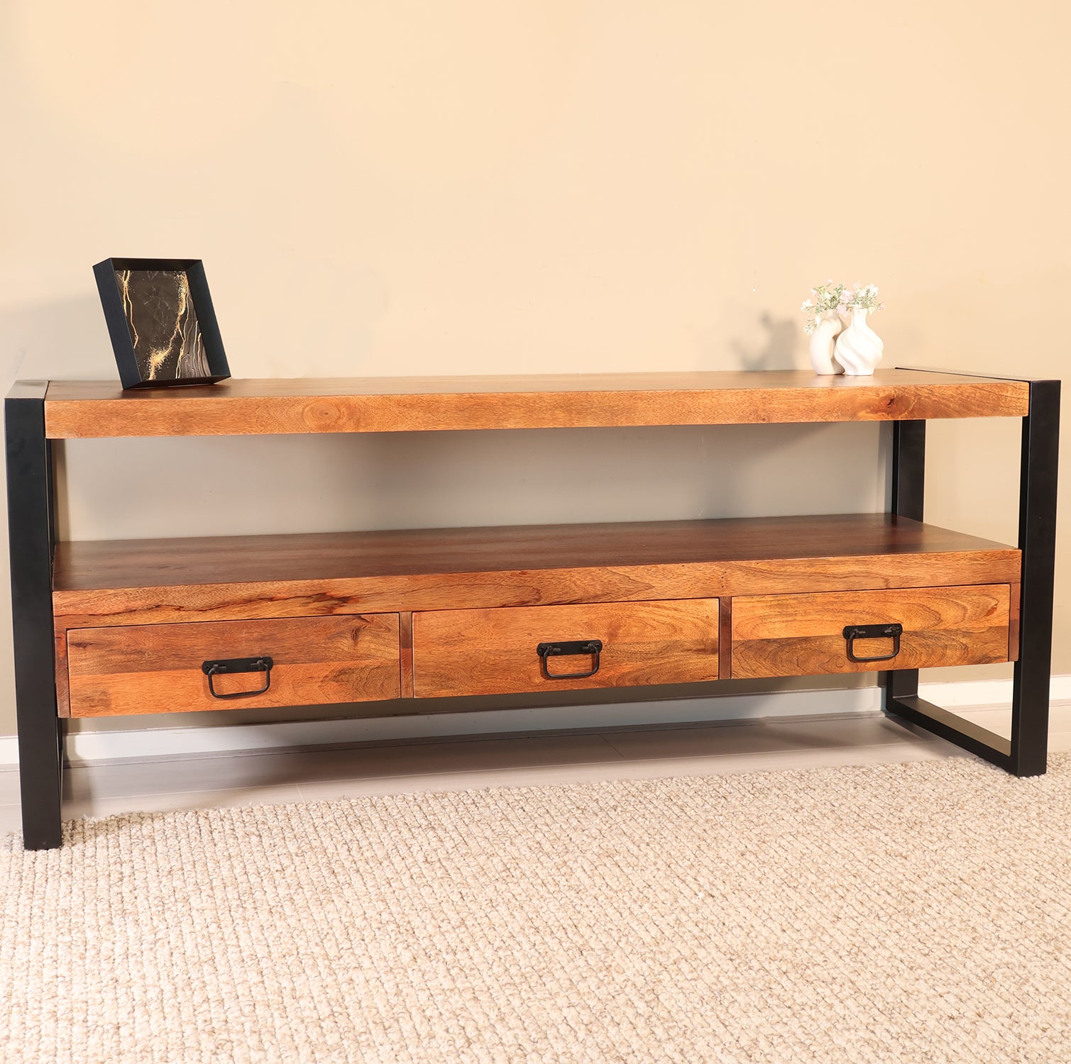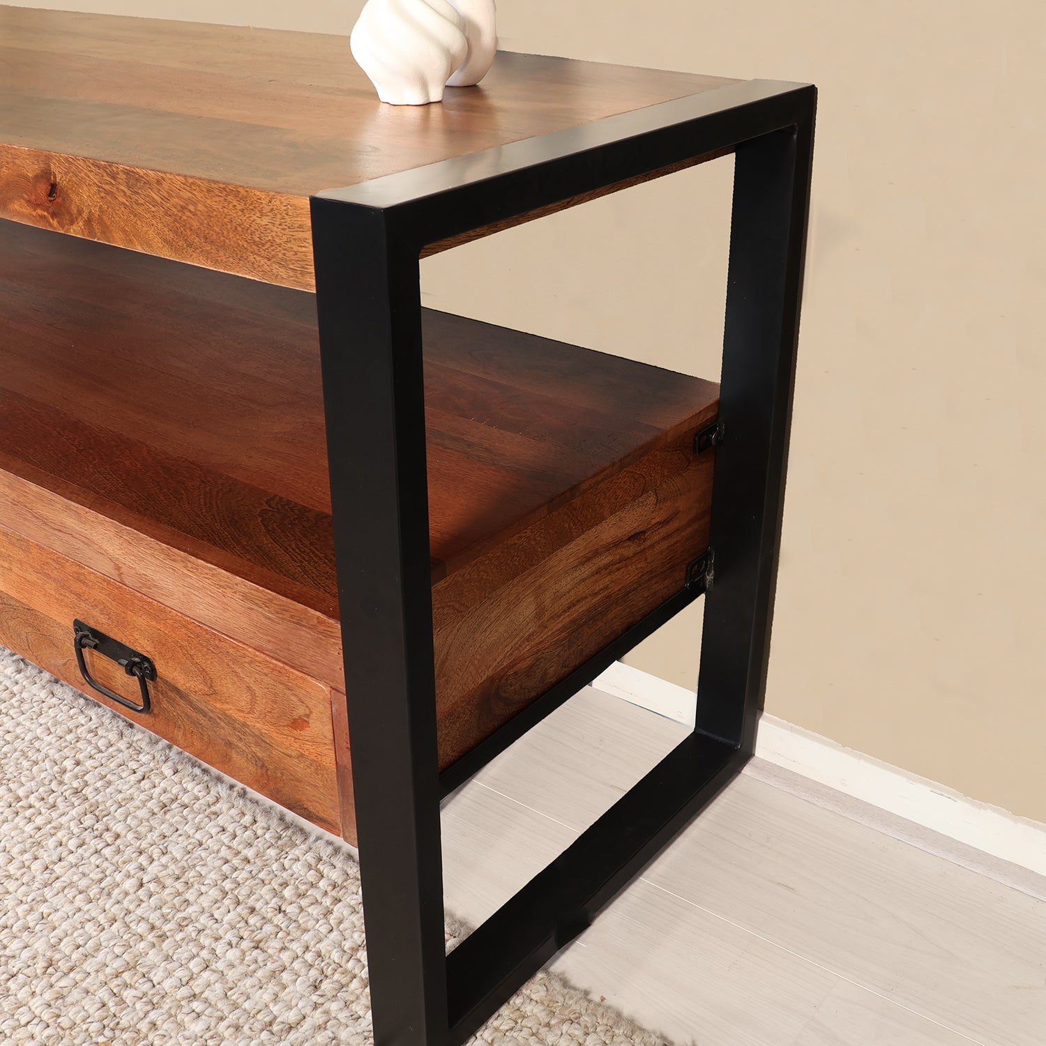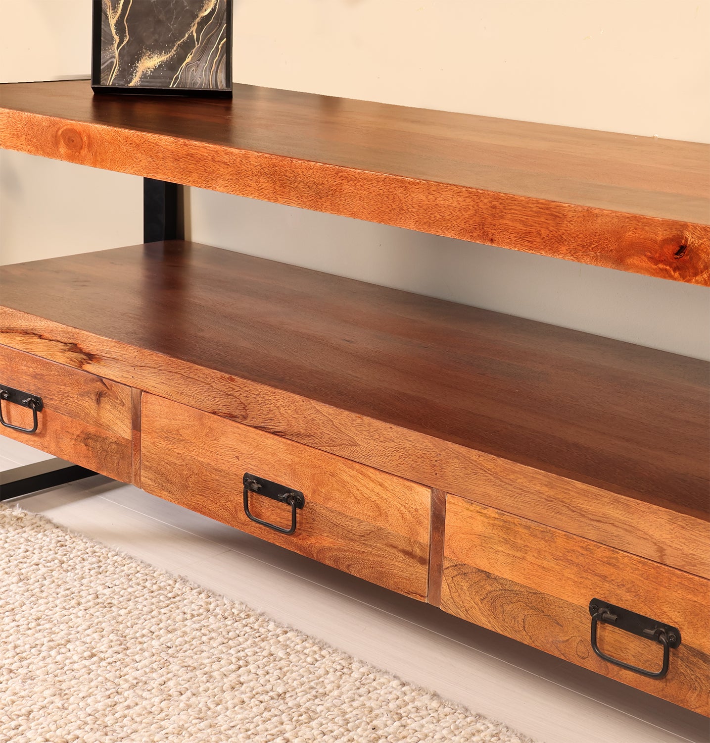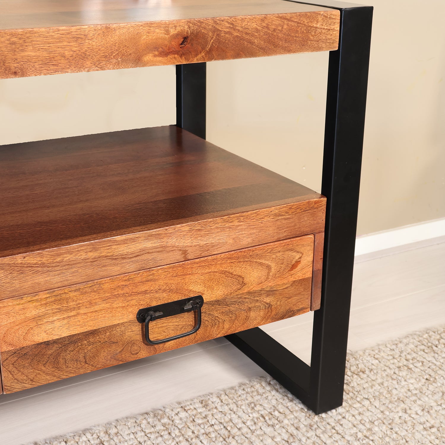 Dit wandmeubel heeft een mangohouten kast en plank, met een zwart metalen onderstel. Door de strakke uitstraling en het compacte formaat kun je het tv meubel op veel plaatsen kwijt, niet alleen als TV meubel maar ook als stoer en industrieel wandmeubel! Dit meubel is slijtvast en geeft jarenlang plezier!