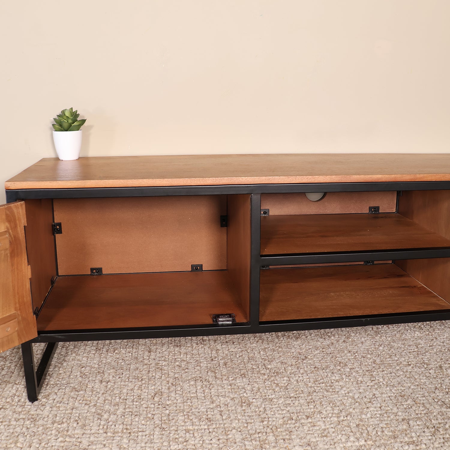 Dit stijlvolle tv-meubel combineert een warme, natuurlijke uitstraling met een stoer industrieel karakter. Het massieve mangohout straalt warmte en karakter uit, terwijl het metalen frame zorgt voor stabiliteit en een eigentijdse look. Dankzij de combinatie van twee deuren en twee open vakken biedt het meubel volop ruimte voor media-apparatuur, boeken of decoratieve items. De geïntegreerde kabelgaten maken het eenvoudig om snoeren netjes weg te werken, zodat jouw woonkamer er altijd opgeruimd uitziet.