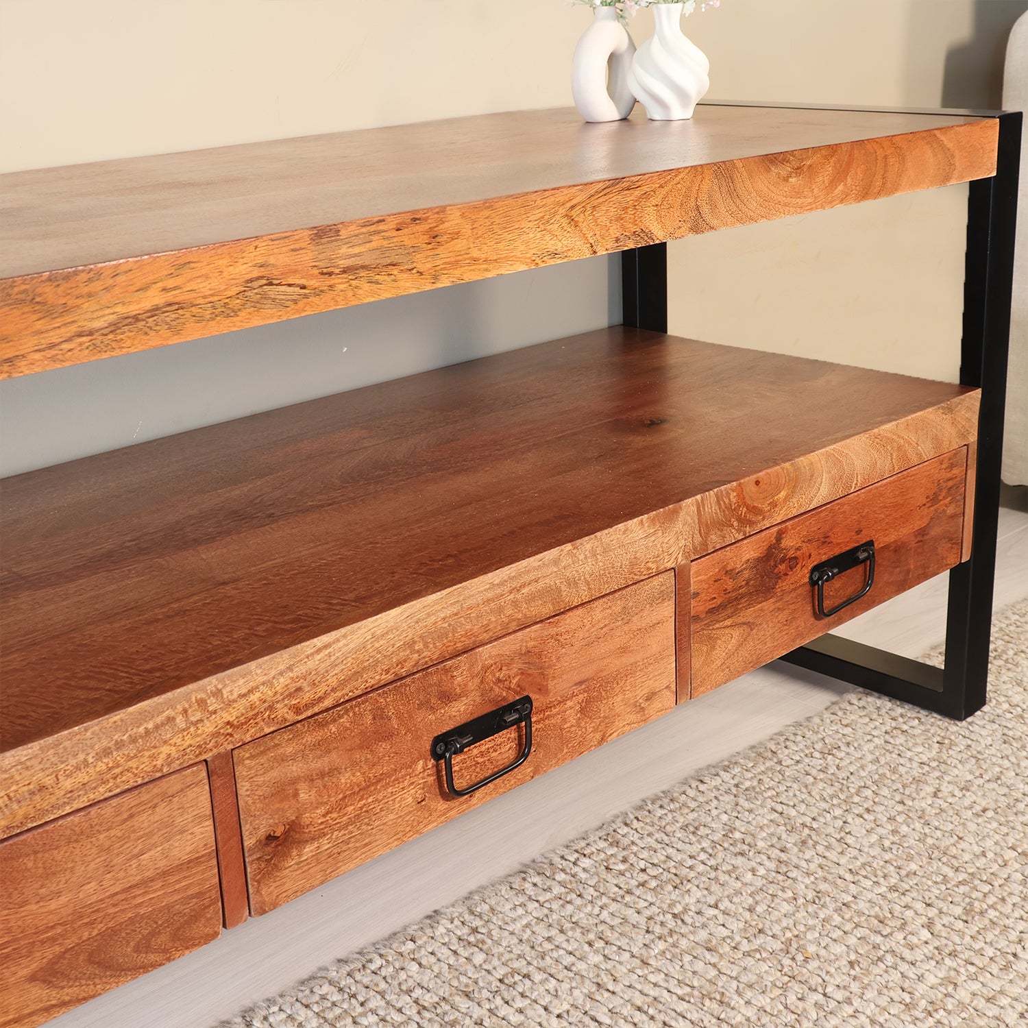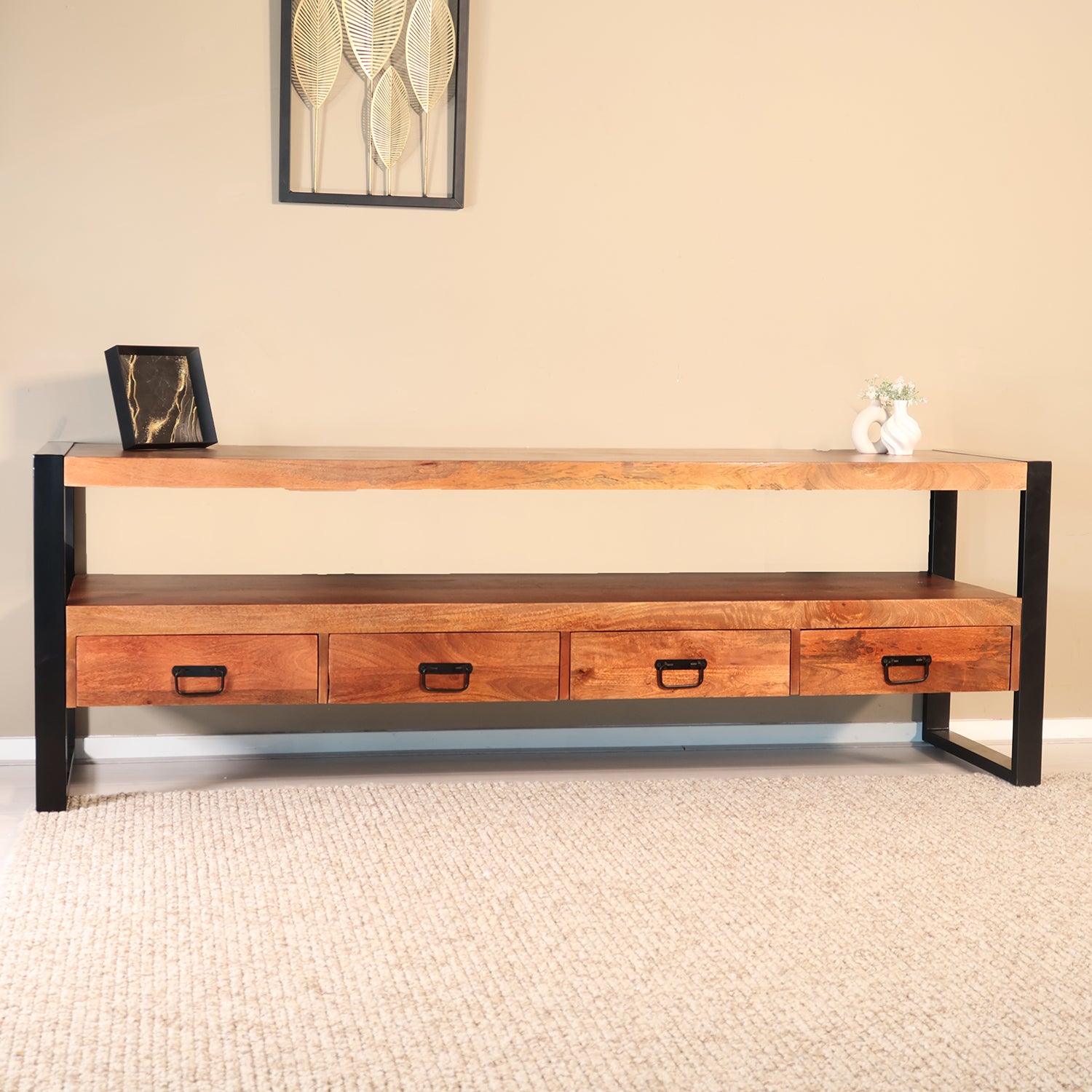 Dit wandmeubel heeft een mangohouten kast en plank, met een zwart metalen onderstel. Door de strakke uitstraling en het compacte formaat kun je het tv meubel op veel plaatsen kwijt, niet alleen als TV meubel maar ook als stoer en industrieel wandmeubel! Dit meubel is slijtvast en geeft jarenlang plezier!