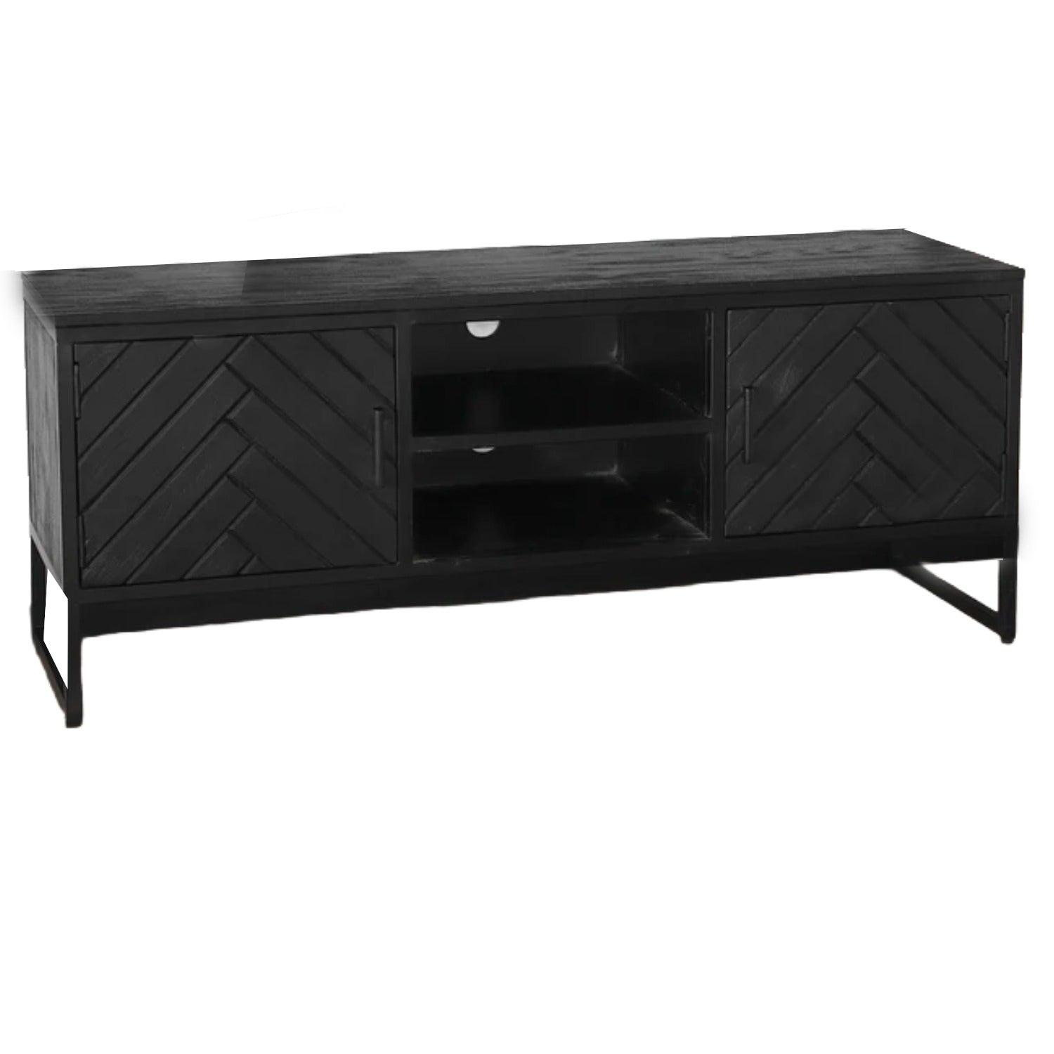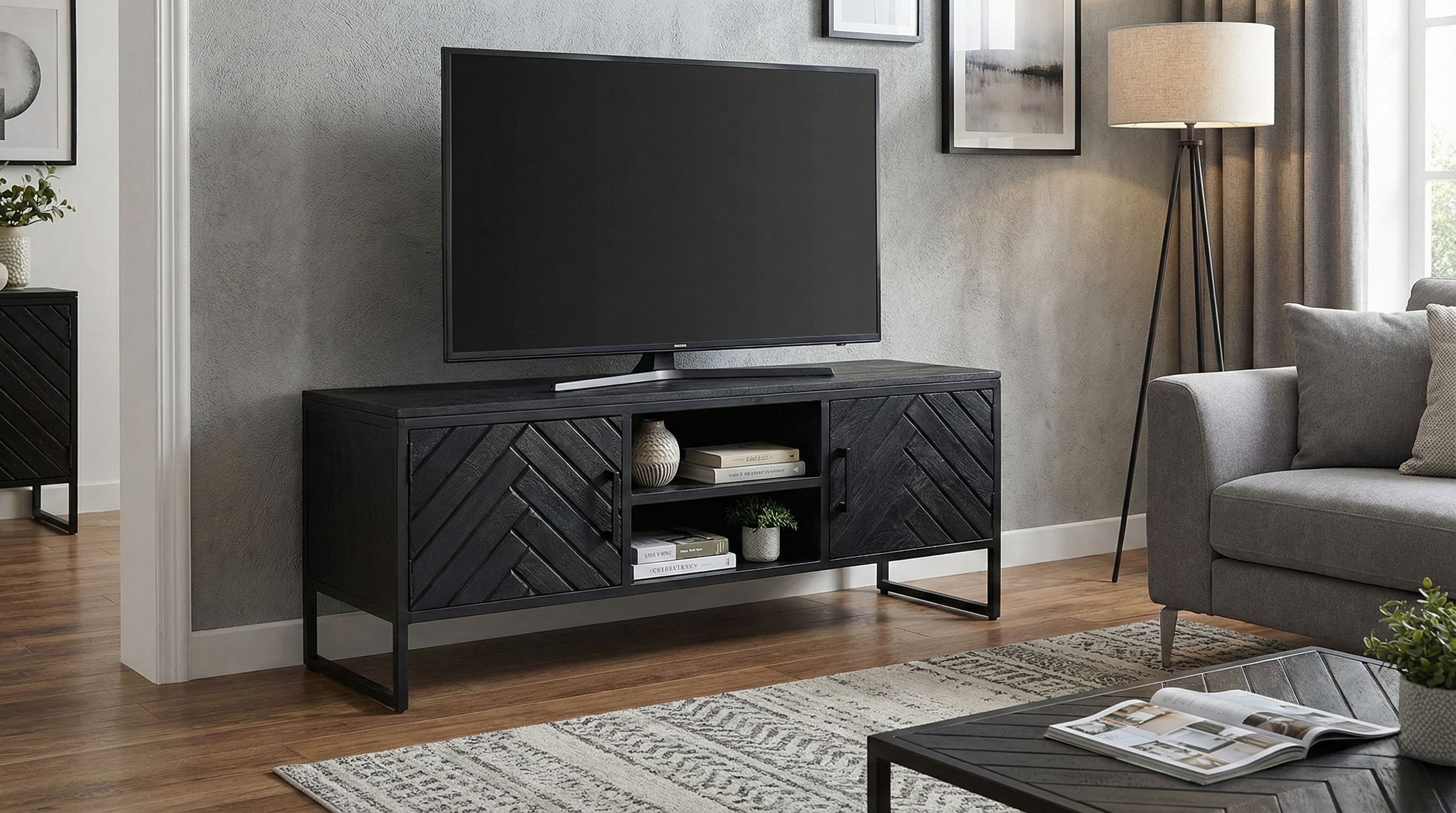Met zijn robuuste design en warme uitstraling is dit stijlvolle tv-meubel een echte aanwinst voor je interieur. De combinatie van mangohout en gepoedercoat metaal zorgt voor een stoere, industriële look die moeiteloos past in zowel moderne als landelijke woonstijlen. Dankzij de twee deuren en open vakken biedt dit meubel voldoende opbergruimte voor al je media-apparatuur, tijdschriften en woonaccessoires. De handige kabelgaten aan de achterzijde zorgen ervoor dat alles netjes en georganiseerd blijft — ideaal voor een opgeruimde woonkamer met karakter.