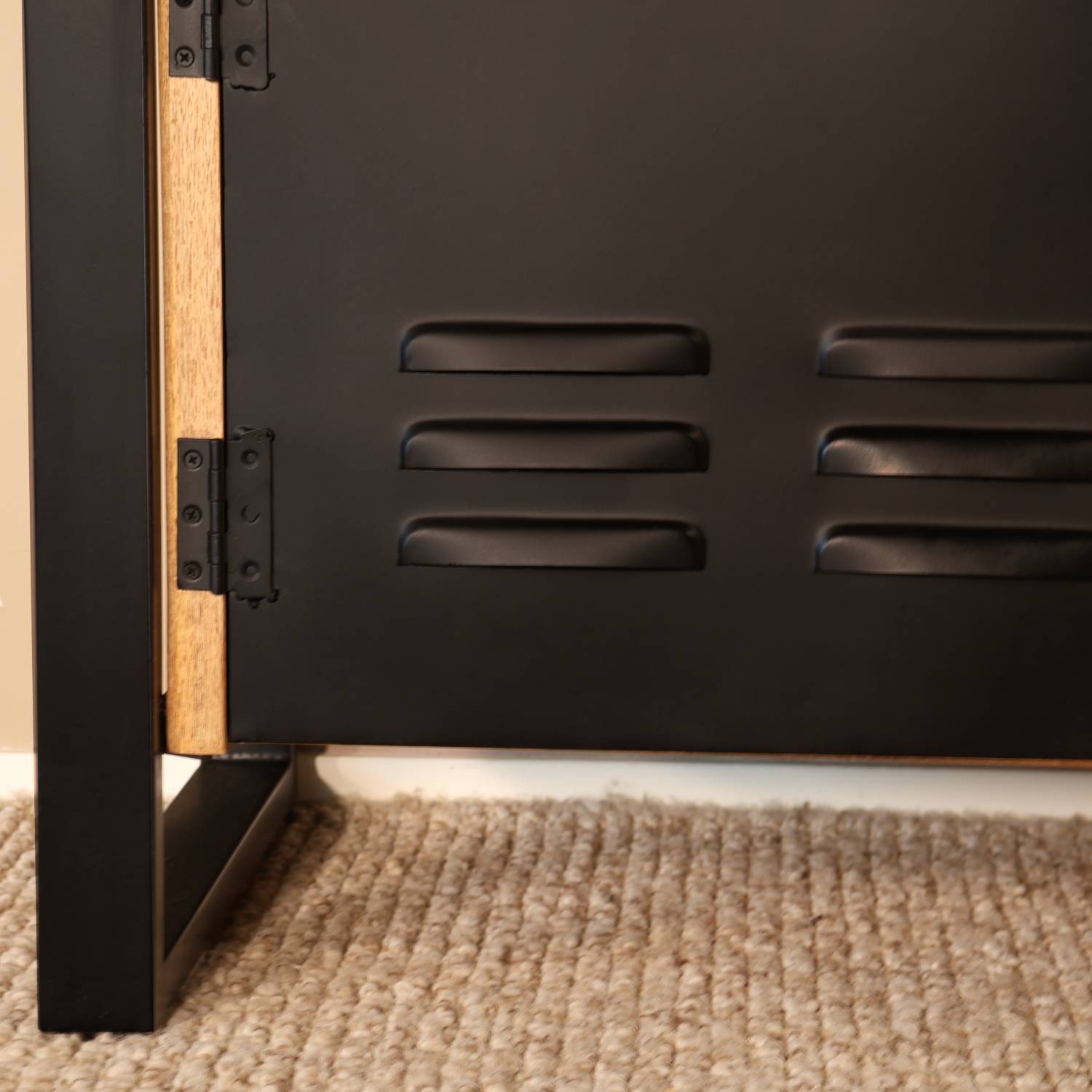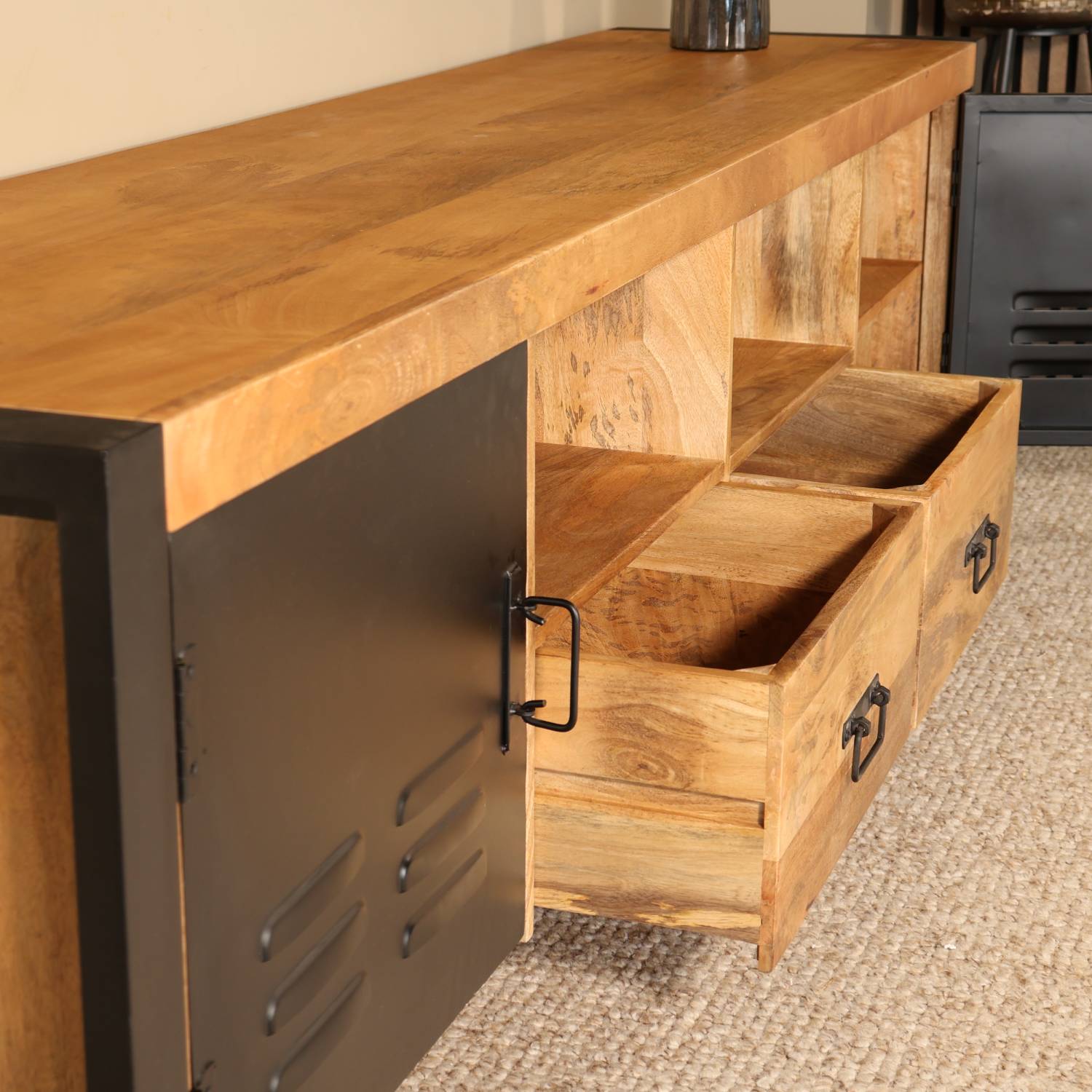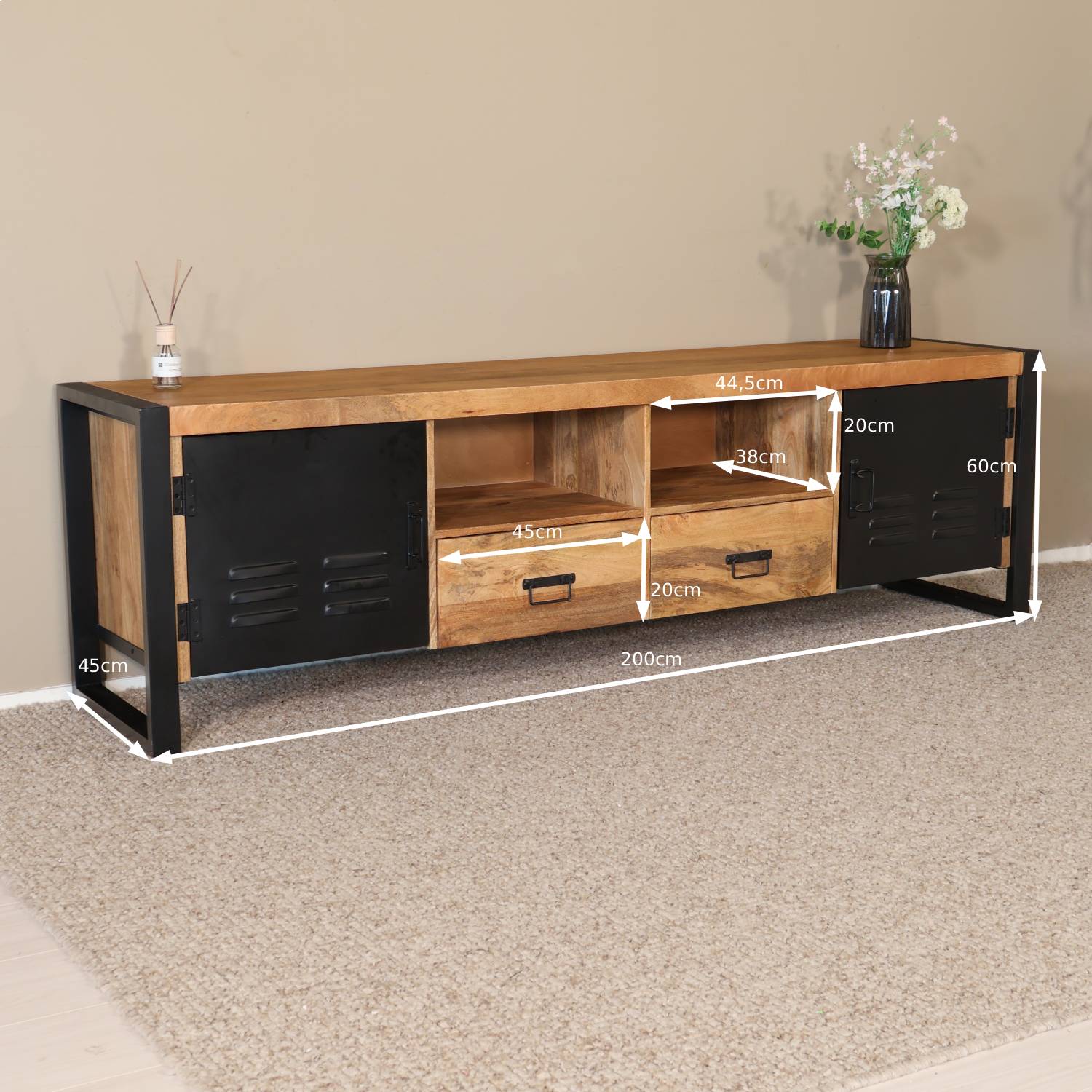 Dit royale tv-meubel van mangohout en metaal brengt een stoere industriële sfeer in je interieur. Met zijn lengte van twee meter biedt het meubel meer dan genoeg ruimte voor je televisie, audioapparatuur en decoratieve items. Achter de twee metalen deuren en in de lade berg je moeiteloos al je spullen op, terwijl het open vak ideaal is voor je gameconsole of mediabox. De combinatie van het warme hout en het gepoedercoate staal zorgt voor een krachtig contrast dat perfect past in moderne, loft- of industriële woonstijlen.