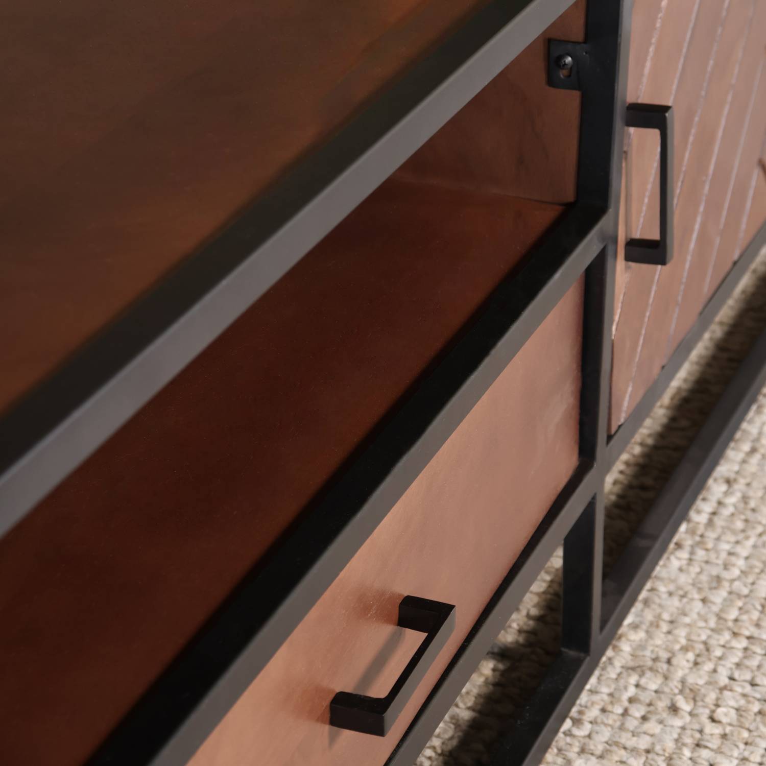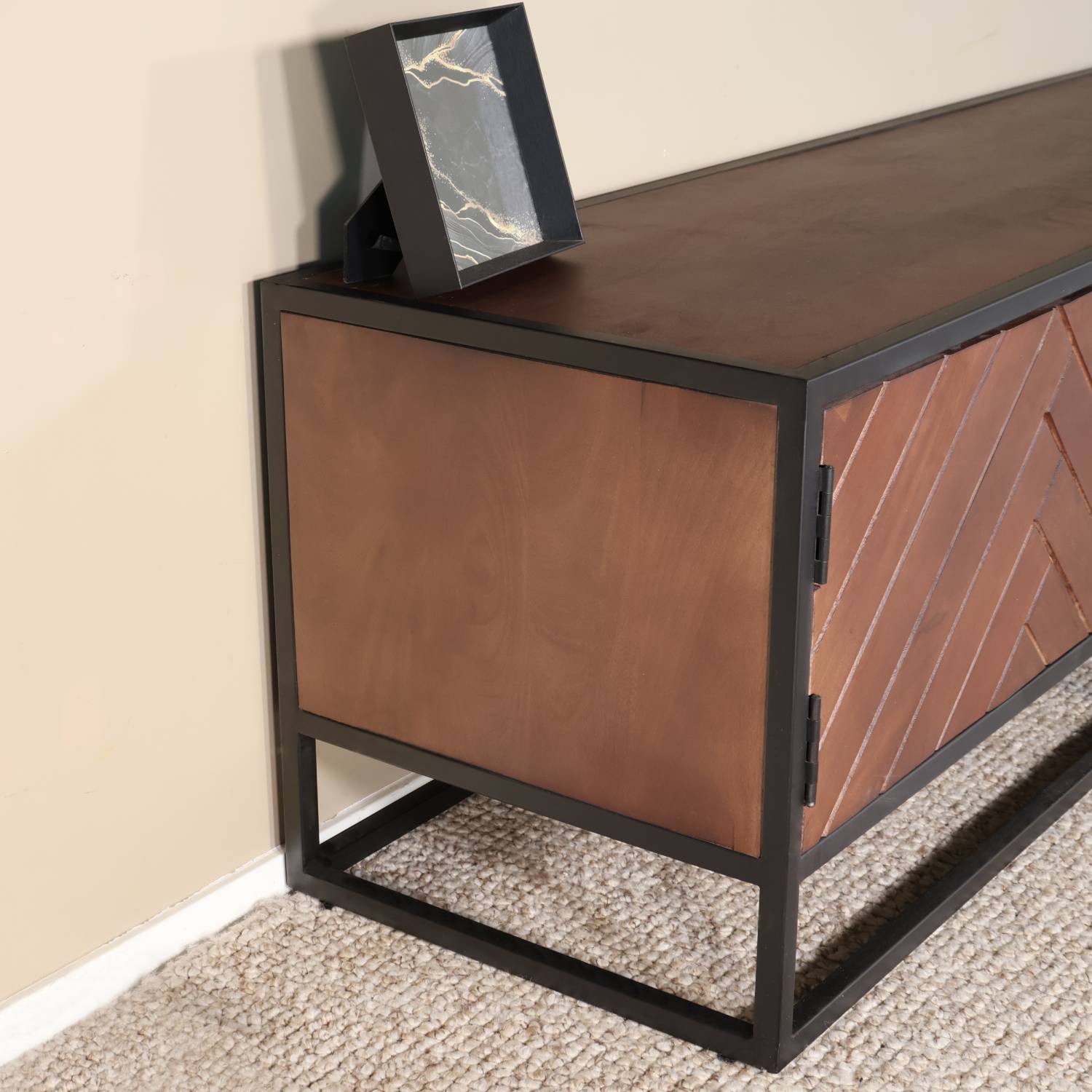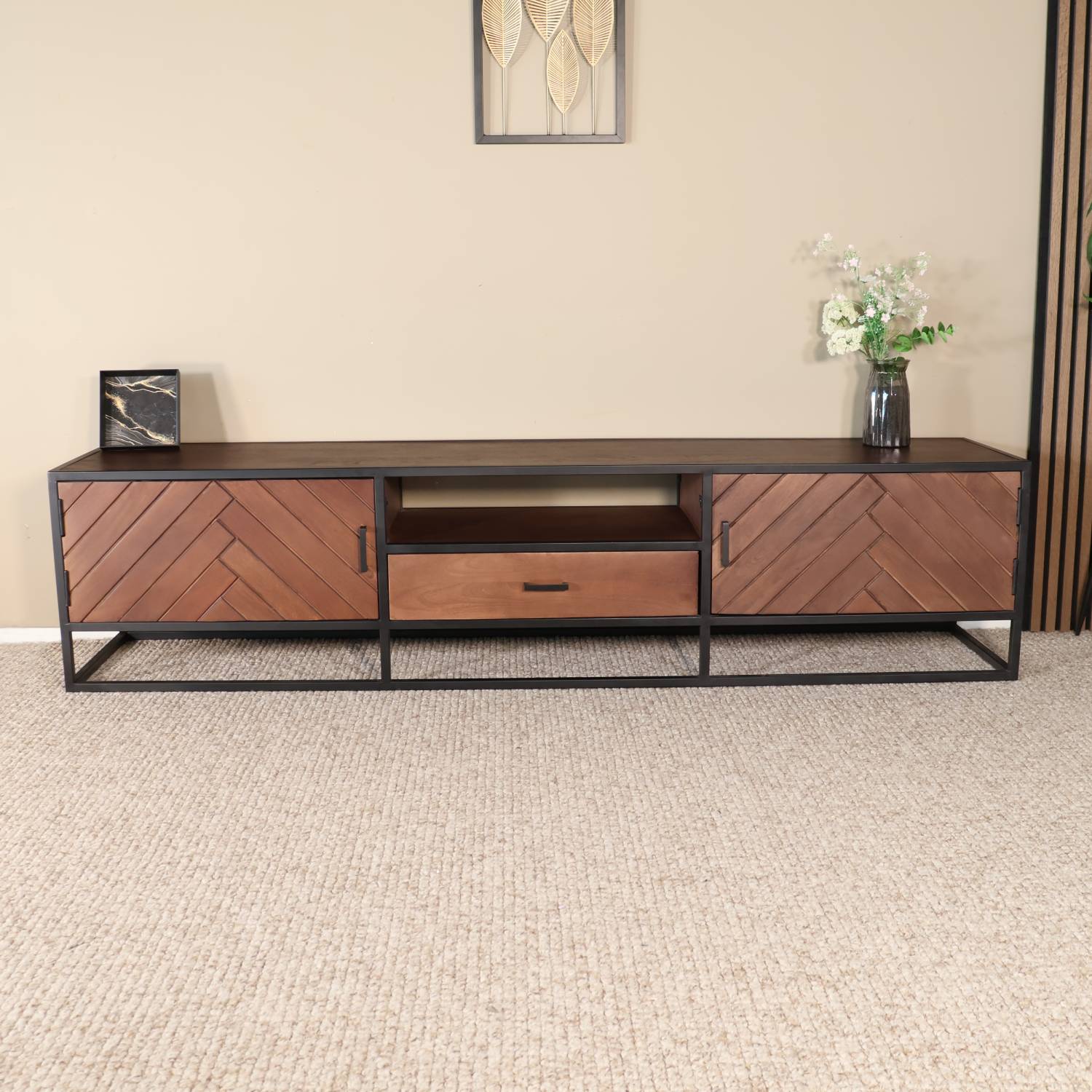 Dit royale tv-meubel straalt luxe en karakter uit dankzij de prachtige visgraatstructuur van het mangohout en het robuuste metalen frame. Het ruime ontwerp biedt volop opbergmogelijkheden: achter de twee deuren kun je grotere spullen uit het zicht bewaren, terwijl de lade ideaal is voor kleine accessoires of afstandsbedieningen. Het open vak is perfect voor mediaboxen of consoles, en het brede bovenblad biedt genoeg plek voor een grote televisie of stijlvolle decoratie. Een indrukwekkend meubel dat functionaliteit en design moeiteloos combineert.