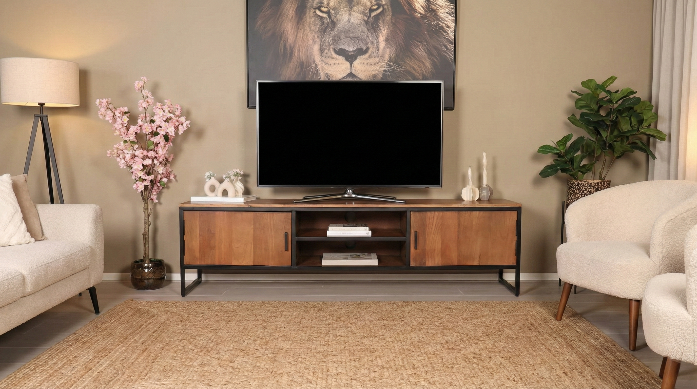 Dit royale tv-meubel combineert stoer industrieel design met de warme uitstraling van echt mangohout. Met zijn ruime lengte van biedt het voldoende plek voor je televisie, soundbar en decoratieve accessoires. Achter de twee deuren kun je moeiteloos al je afstandsbedieningen of tijdschriften opbergen, terwijl de twee open vakken ruimte bieden voor je media-apparatuur. De geïntegreerde kabelgaten zorgen ervoor dat snoeren netjes weggewerkt blijven – praktisch én stijlvol in één meubelstuk.