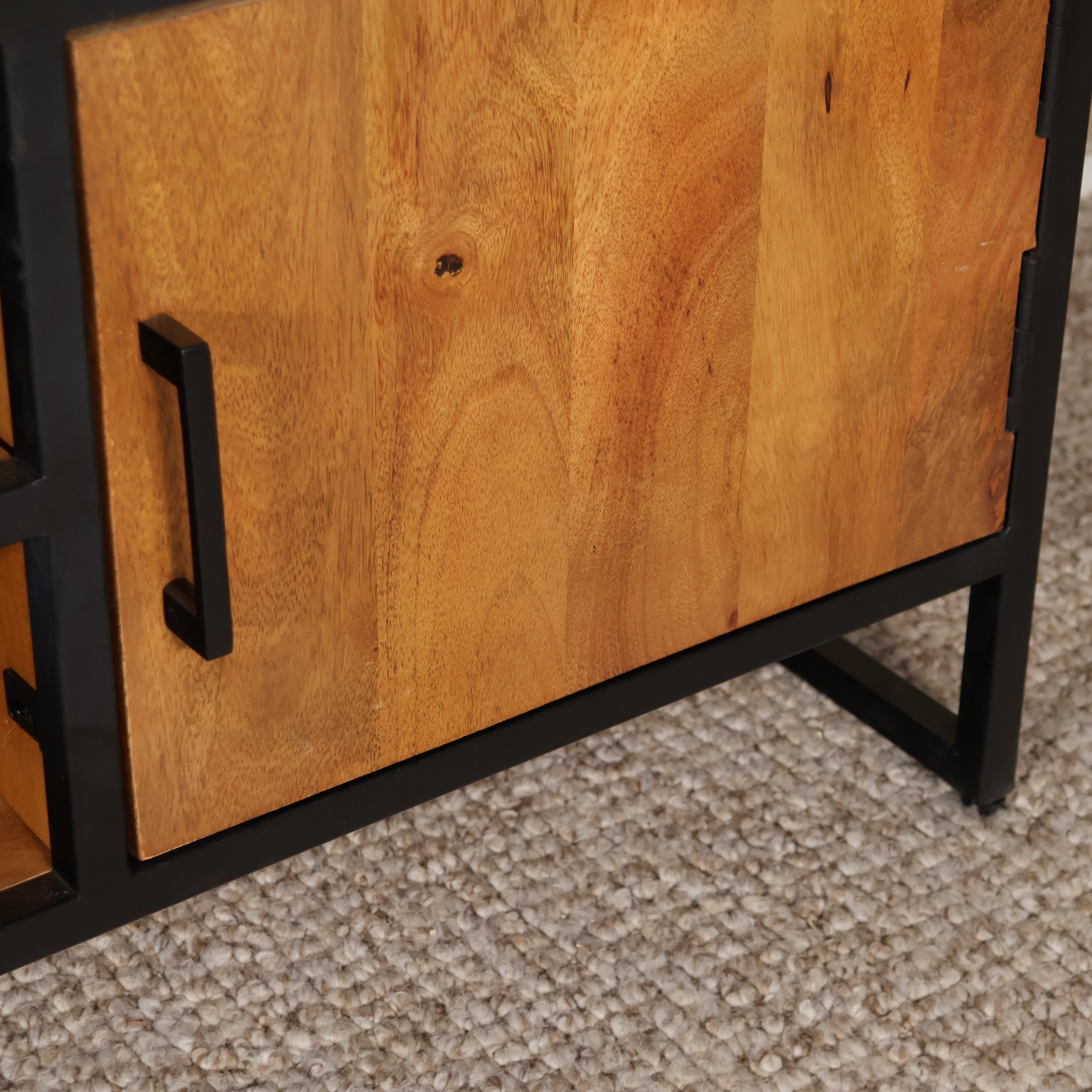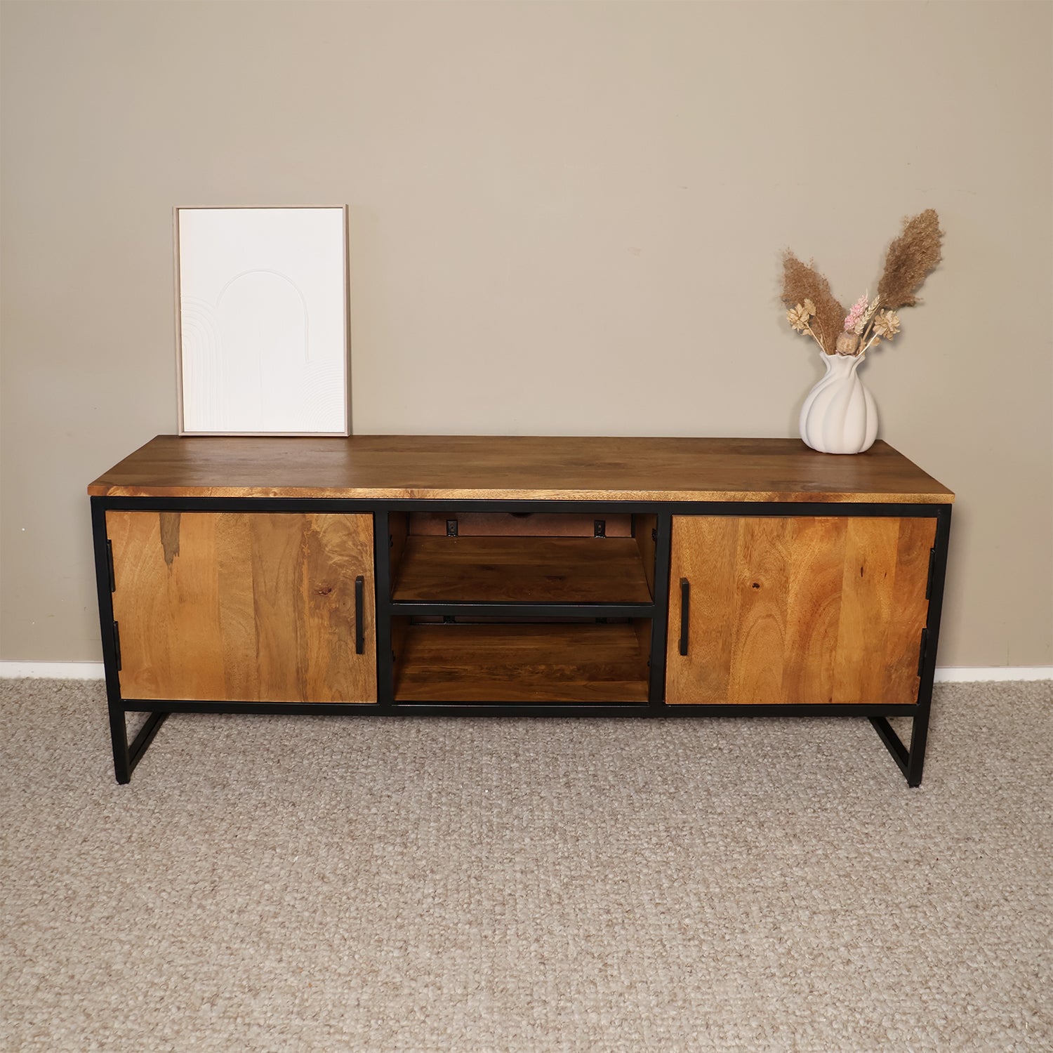 Met zijn robuuste design en warme uitstraling is dit stijlvolle tv-meubel een echte aanwinst voor je interieur. De combinatie van mangohout en gepoedercoat metaal zorgt voor een stoere, industriële look die moeiteloos past in zowel moderne als landelijke woonstijlen. Dankzij de twee deuren en open vakken biedt dit meubel voldoende opbergruimte voor al je media-apparatuur, tijdschriften en woonaccessoires. De handige kabelgaten aan de achterzijde zorgen ervoor dat alles netjes en georganiseerd blijft — ideaal voor een opgeruimde woonkamer met karakter.