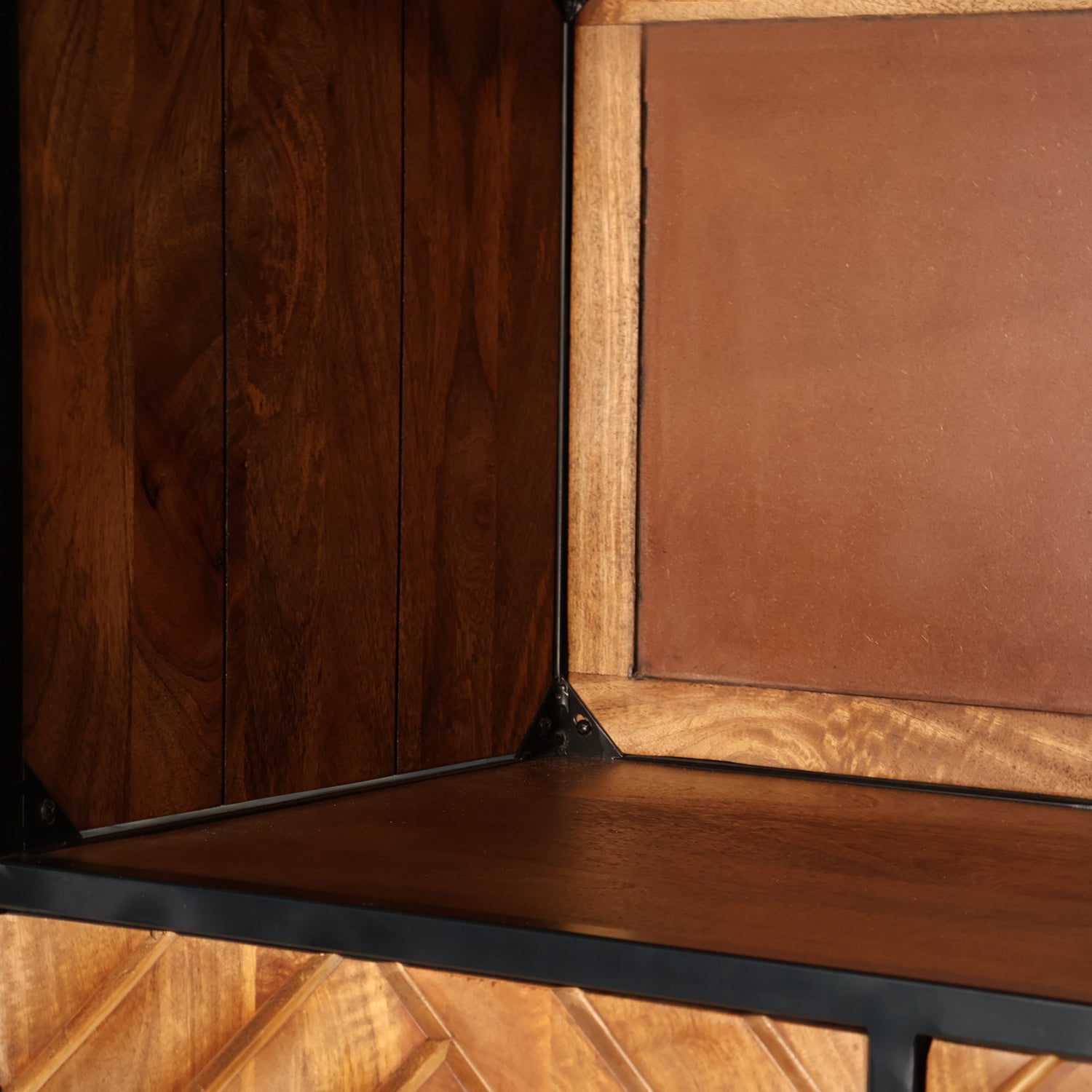 Deze stijlvolle wandkast combineert de warmte van mangohout met de stoere uitstraling van gepoedercoat metaal. Dankzij de visgraatstructuur en het functionele design biedt deze kast zowel karakter als opbergruimte. Perfect voor wie houdt van een industrieel, maar tijdloos interieur.