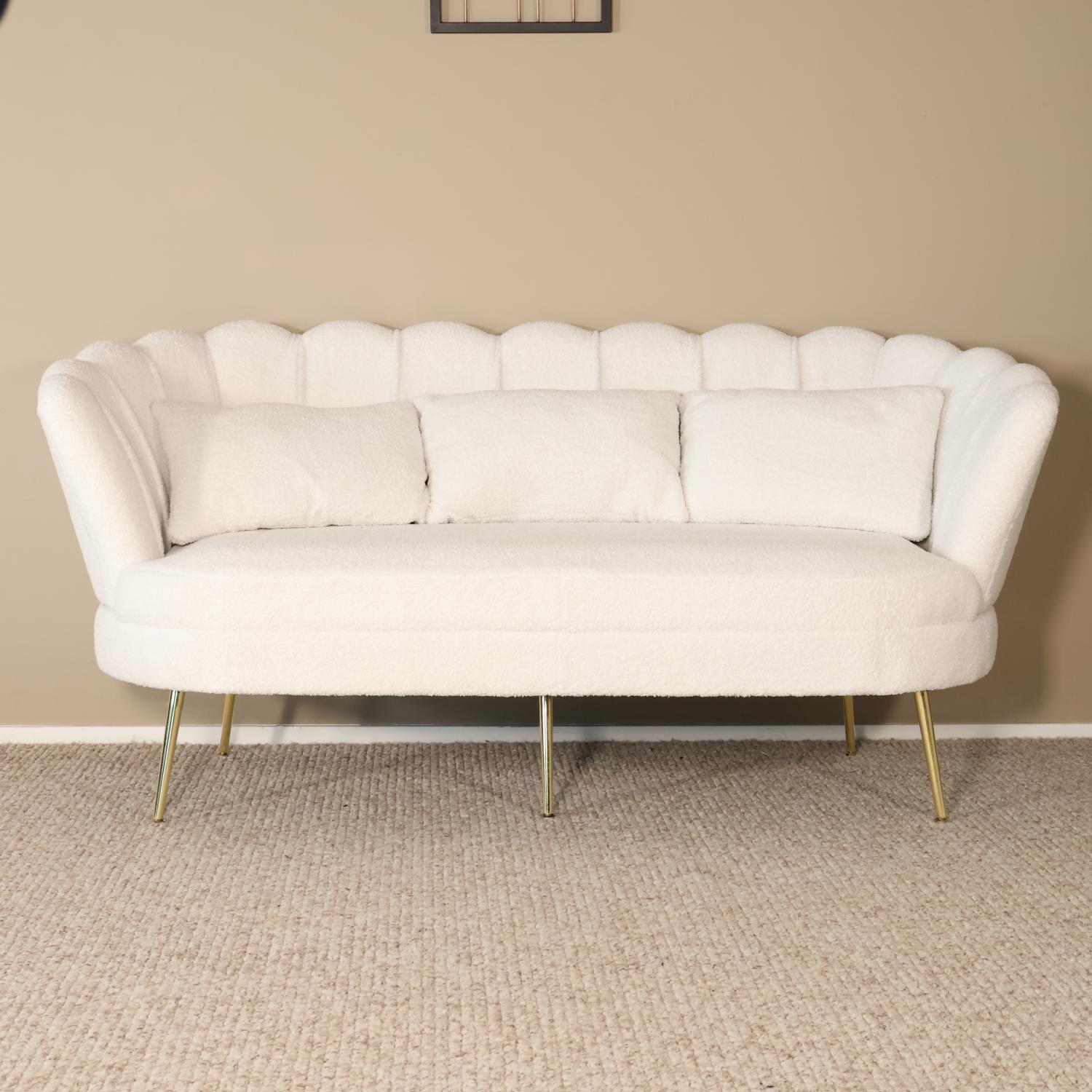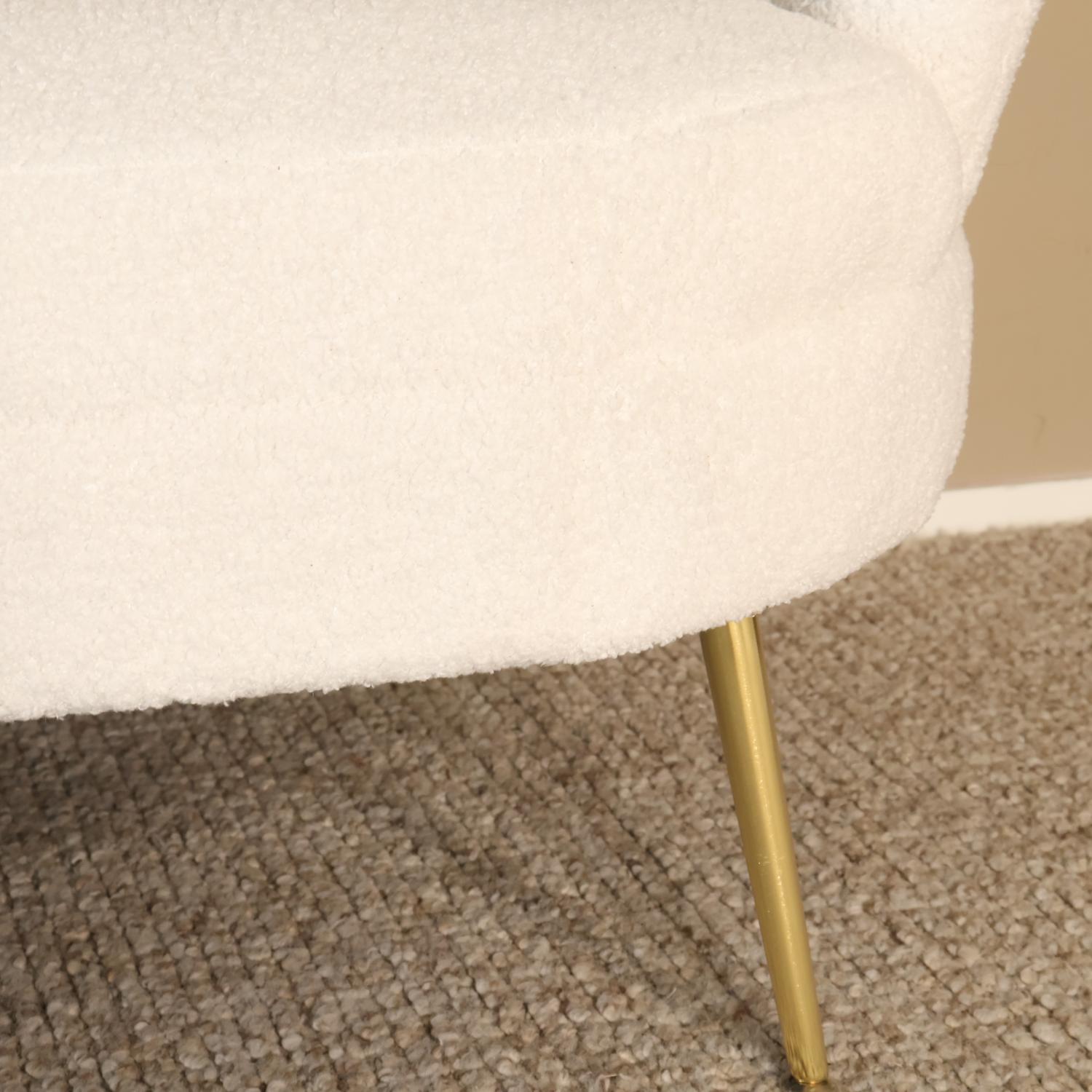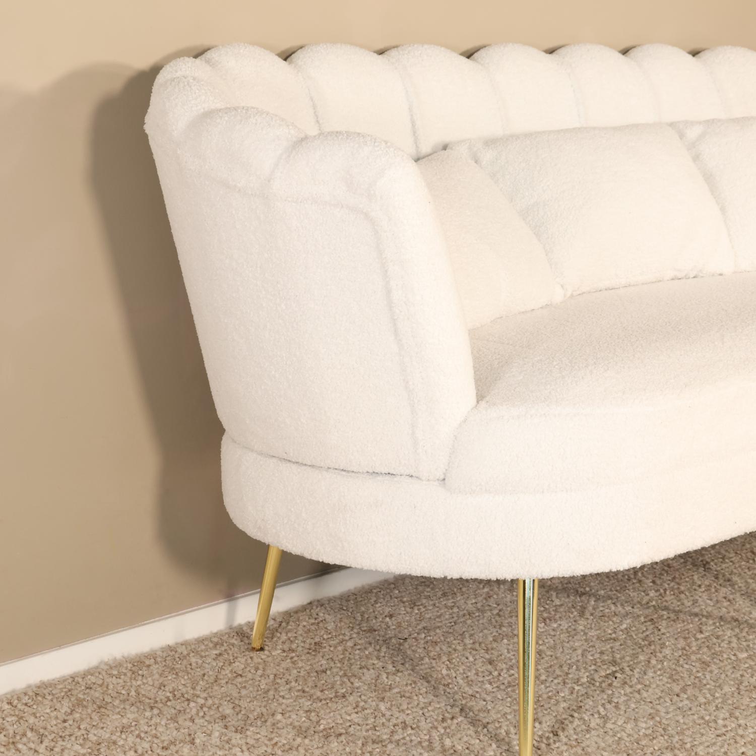 Creëer een warme en stijlvolle sfeer in huis met deze charmante teddy zitbank. De zachte bekleding en de elegante schelpvorm zorgen voor een uitnodigend en comfortabel design dat perfect past in moderne, landelijke of klassieke interieurs. De goudkleurige poten geven de bank een luxe uitstraling, terwijl de ronde rugleuning extra zitcomfort biedt. Perfect voor in de woonkamer, slaapkamer of hal als stijlvolle eyecatcher. Een combinatie van elegantie, comfort en tijdloze klasse!